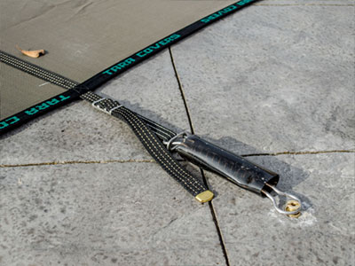 Each Tara safety cover is fully outfitted with high quality hardware and installation equipment. The strength of the safety cover is doubled by sewing the webbing on both sides of the safety cover, doubling the thickness. The perimeter straps are reinforced with a bar box tack stitching and only UV resistant thread is used throughout the safety cover. All of the anchors and end caps are non-corrosive solid brass for durability and longevity. Stainless steel hardware, including springs and buckles are standard. To provide maximum protection for the decking all springs have tinted PVC covers and only non-staining polyethylene is used for rub-strips. See tabs above for the Tara cover brochure and warranty information.