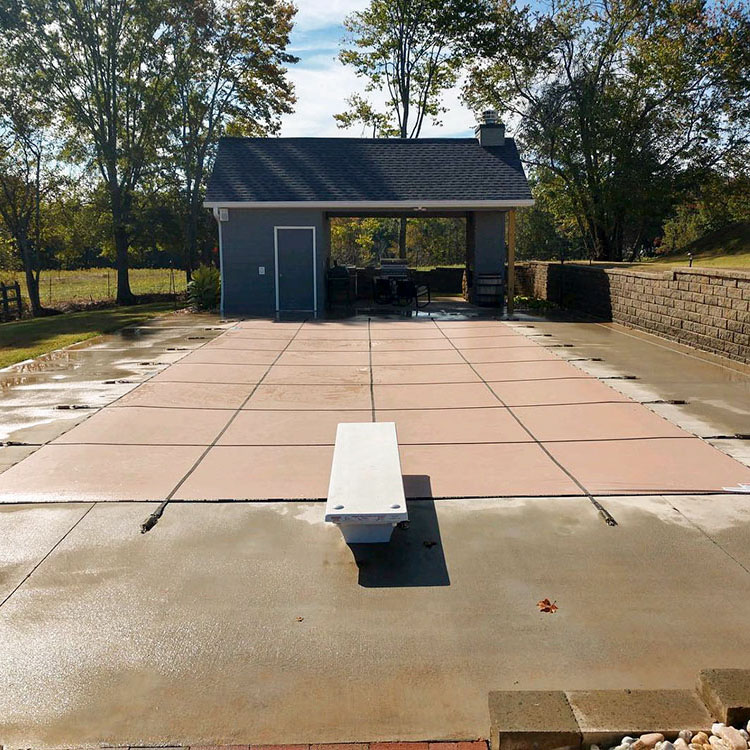 Both the standard mesh and HD mesh safety covers drain water quickly from the surface. Each filter the water so that leaves, debris and most particles do not fall in the pool. The HD Mesh has an extremely dense weave that filters more debris than standard mesh. The solid safety cover will not allow water or sunlight into the pool. The solid safety cover will not allow water or sunlight into the pool. This prevents algae growth and gives you clean, clear water in the spring. Solid safety covers require the use of an automatic pool pump or drain panel to remove water from the surface.