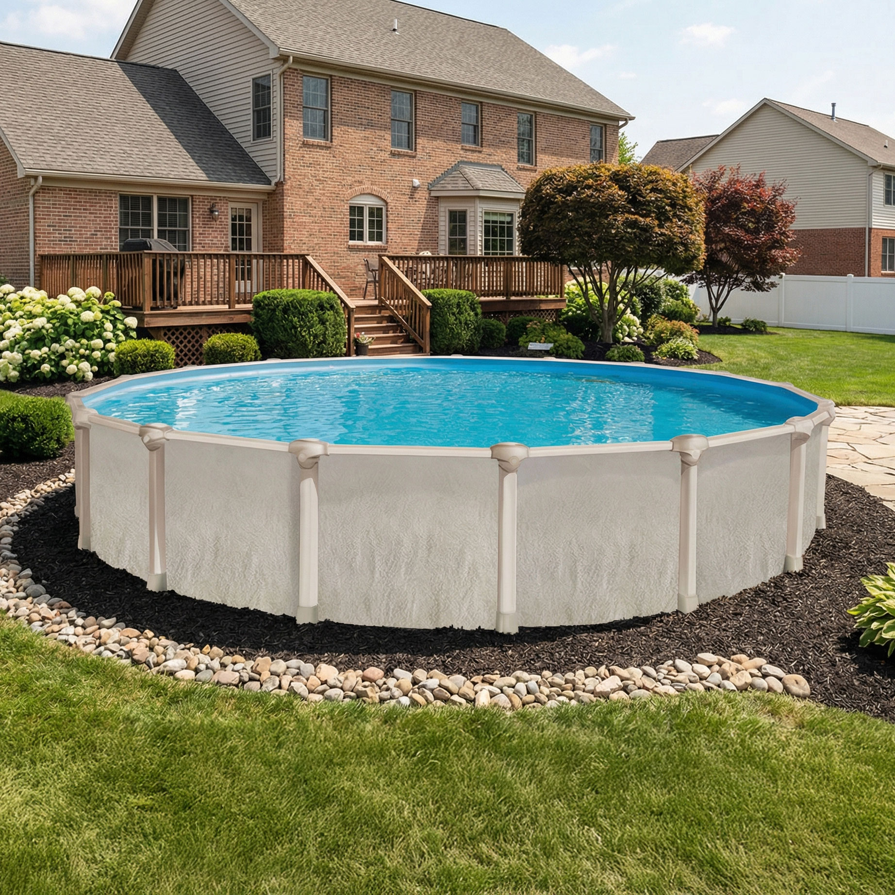 A 21 Ft Round 52 In Deep Ohana Above Ground Pool Kit is the ultimate in steel pools! The Ohana’s steel structure is entirely protected by a variety of finishes. These optimize the resistance to corrosion while preventing condensation between the liner and the wall – ensuring a long, solid life for your pool. Ohana pool walls are corrugated for increased durability and resistance to ice and impact damage. Only our pools feature the self-supporting omega stabilizer bar developed to simplify homeowner installation. The ease of assembly has made our pools the number one choice of many professional installers. Ohana’s unique quadra-fold system and bolting pattern provide maximum wall joint strength. The 7″ wide top ledge has a Synpro resin cover with rounded corners & a design that hides screws – the resin cover will never chip or discolor. This combination provides incredibly long lasting all weather protection with added resistance against corrosion, scratching and damaging UV rays.