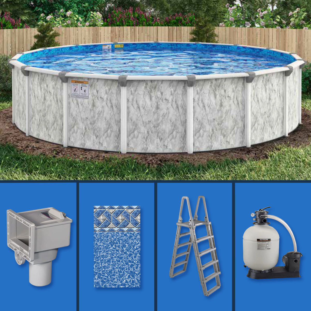 A 30′ Round Sea Shore Above Ground Pool Kit Package provides the strength of steel and the beauty of resin, along with an attractive wall pattern, to create the backyard of your dreams! This pool will bring style and elegance to your backyard.
