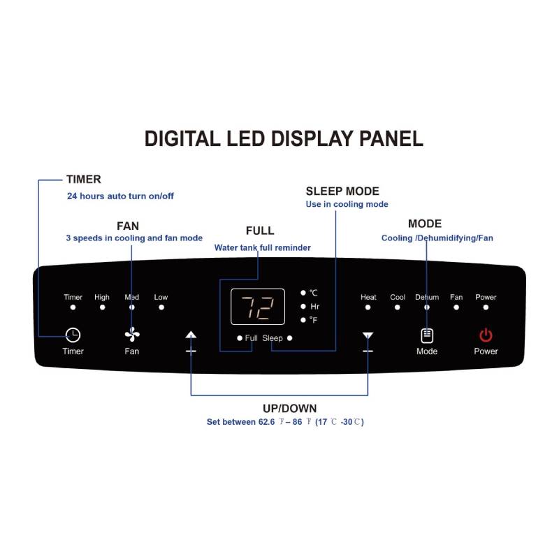 - Digital thermostat control range: 62.6 degrees F – 86 degrees F (17 degrees C -30 degrees C)