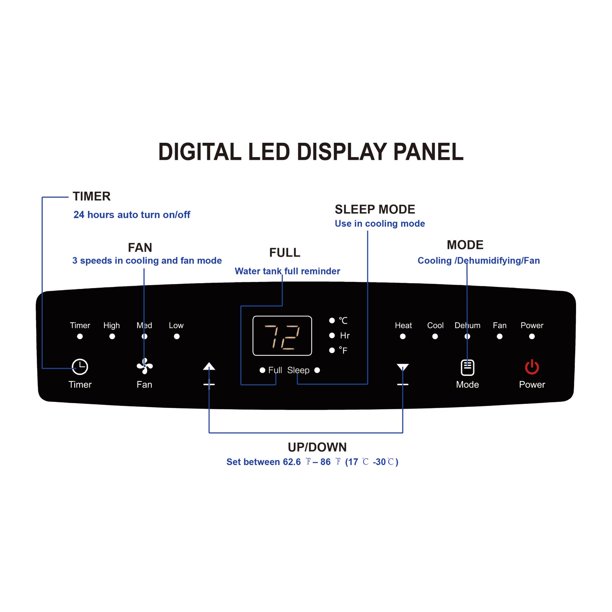 - Digital thermostat control range: 62.6F – 86F (17C -30C)