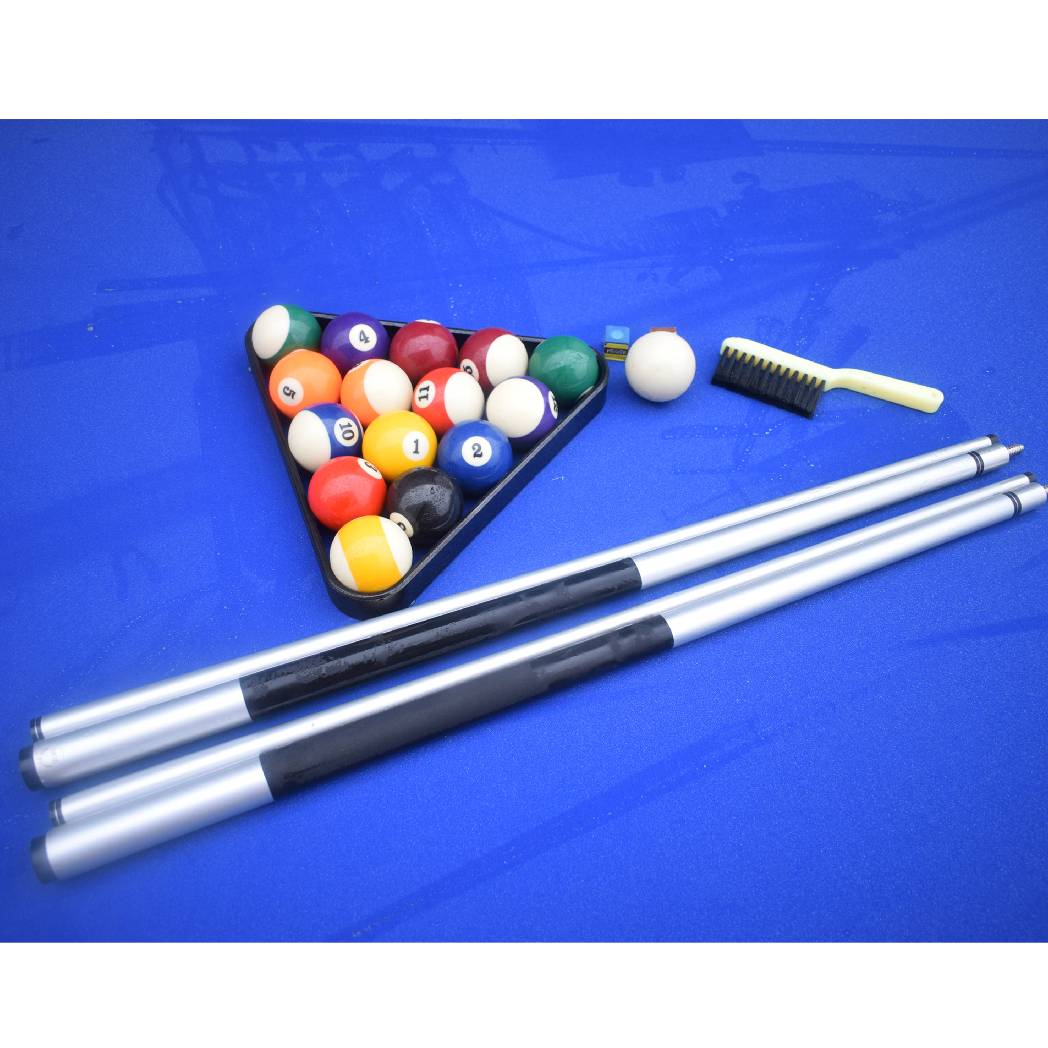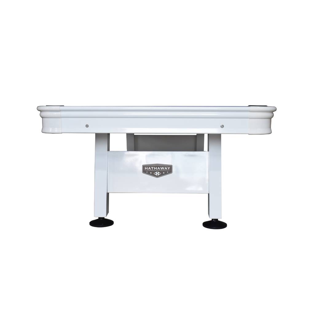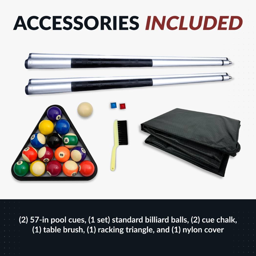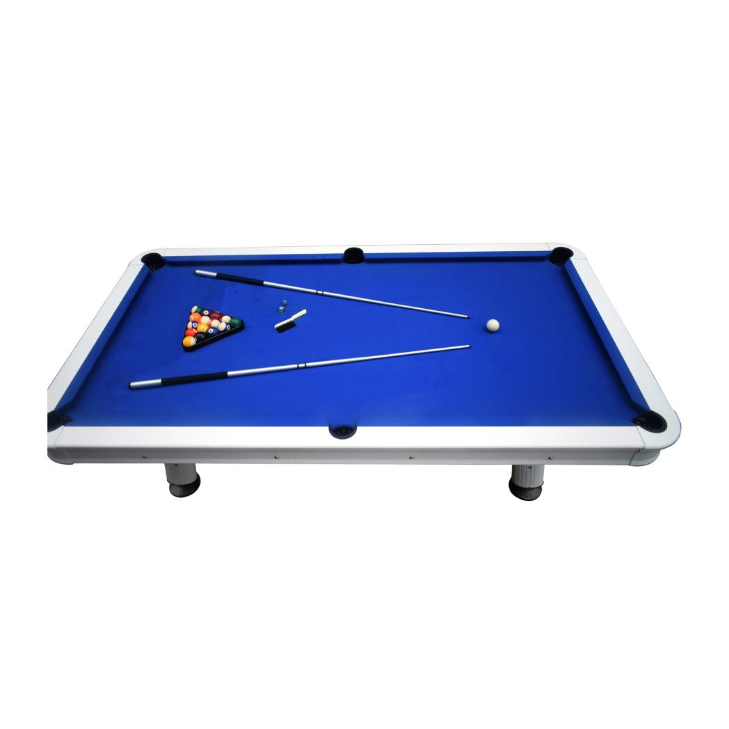 Bring classic billiards to your patio, pool or yard with this sleek and durable pool table. The Alpine 8′ Outdoor Pool Table with Aluminum Rails & Waterproof Felt features waterproof, UV-resistant felt that stands up to the strongest rainstorm and brightest summer day. Its sturdy, rails and corners are coated in gloss white powder, providing a sleek look that fits any season. K55 gum rubber cushions and a regulation, 8-ft size ensure quality, tournament-ready play. Get the fun started in minutes with simple, no-hassle assembly. Simply bolt on the legs and adjust the sturdy, built-in leg levelers. Comes complete with everything you need to play, including 2-composite cues, 1- set of 2 – ¼ In. balls, 2-pieces of chalk, ABS plastic triangle, ABS plastic brush, and a rip-resistant nylon cover. 1-Year Limited Warranty.