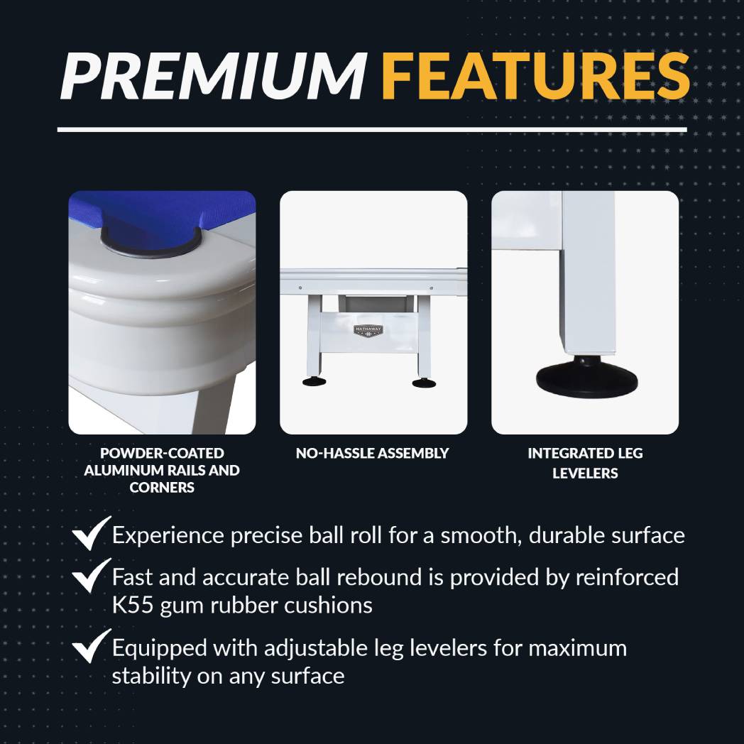 - TOURNAMENT READY – Enjoy responsive, accurate action with the Alpine’s pro-ready K55 gum rubber cushions. Its weather-resistant felt stays firm and level, regardless of the weather. Bring exciting, action-packed tournaments to your yard, deck or patio.