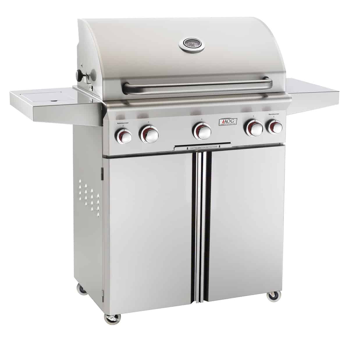 The American Outdoor Grill T-Series 30″ 3-Burner Freestanding Gas Grill provides a high-end gas grill with a sturdy design. This unit features a complete 304 stainless steel construction to ensure a long lasting and durable product while the 30″ x 18″ grilling surface provides plenty of grilling area at 540 square inches. The (3) 16,000 BTU tube burners feature the same stainless steel construction and offer a large amount of heat to provide some serious grilling. The stainless steel vaporizer panels help to provide even heat distribution across the grilling surface to prevent hot and cold zones and prevent flair-ups a the custom analog thermometer features a stainless steel bezel for high-quality temperature control. The stainless steel cart features (2) stainless steel side shelves, and durable 2.5-inch wheels to provide mobility. Exclusive to the “T” Series, this grill features the “Rapid-Light” piezo ignition for a reliable start every time and is backed by AOG’s 15-year warranty.