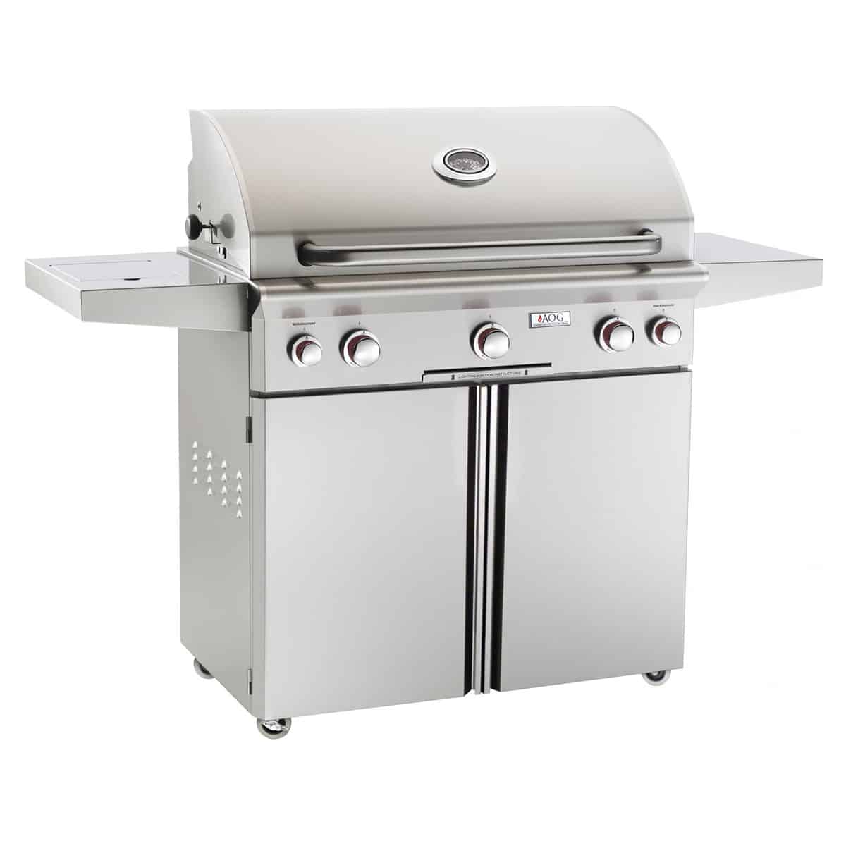 The American Outdoor Grill T-Series 36″ 3-Burner Freestanding Gas Grill provides a high-end gas grill with a sturdy design. This unit features a complete 304 stainless steel construction to ensure a long lasting and durable product while the 36″ x 18″ grilling surface provides plenty of grilling area at 648 square inches. The (4) 16,000 BTU tube burners feature the same stainless steel construction and offer a large amount of heat to provide some serious grilling. The stainless steel vaporizer panels help to provide even heat distribution across the grilling surface to prevent hot and cold zones and prevent flair-ups a the custom analog thermometer features a stainless steel bezel for high-quality temperature control. The stainless steel cart features (2) stainless steel side shelves, and durable 2.5-inch wheels to provide mobility. Exclusive to the “T” Series, this grill features the “Rapid-Light” piezo ignition for a reliable start every time and is backed by AOG’s 15-year warranty.