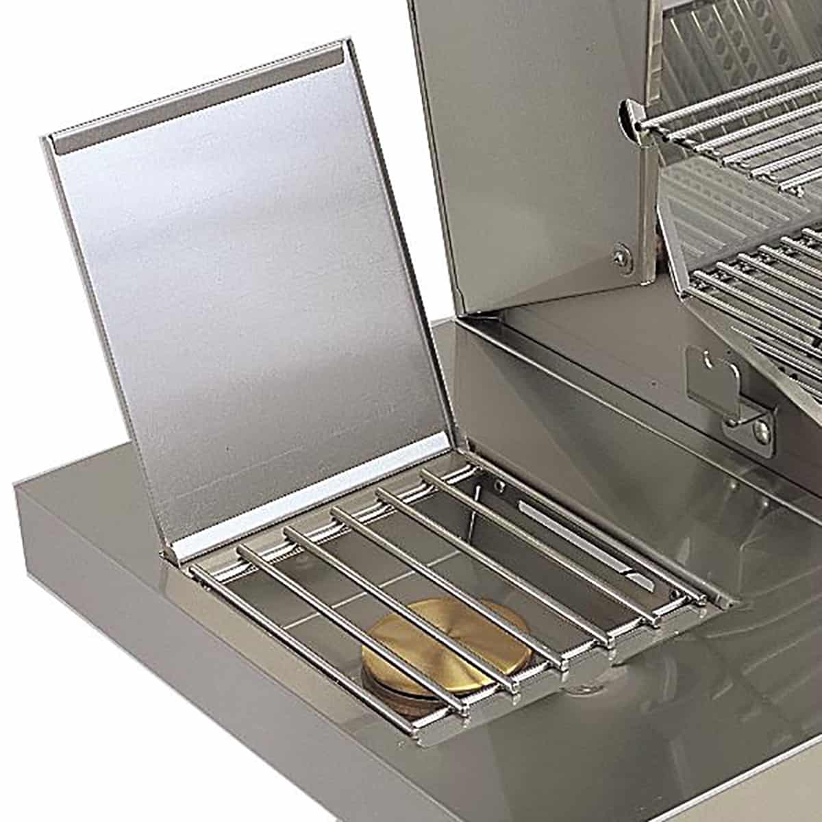 - Flush mounted brass side burner on portable grills-12,000 BTU’s