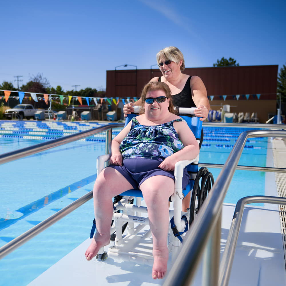 Aqua Creek’s PVC pool access chairs are an economical choice for providing easier ADA access for sloped entries and ramps. The lightweight, durable construction makes these chairs an ideal solution for your facility. The PVC material is not only affordable and lightweight but resists corrosion. Their PVC pool access chairs are also great for use in locker rooms, showers, and other areas around your aquatic facility. Choose from three different sizes with mesh seats. These are only available in white PVC with blue mesh.