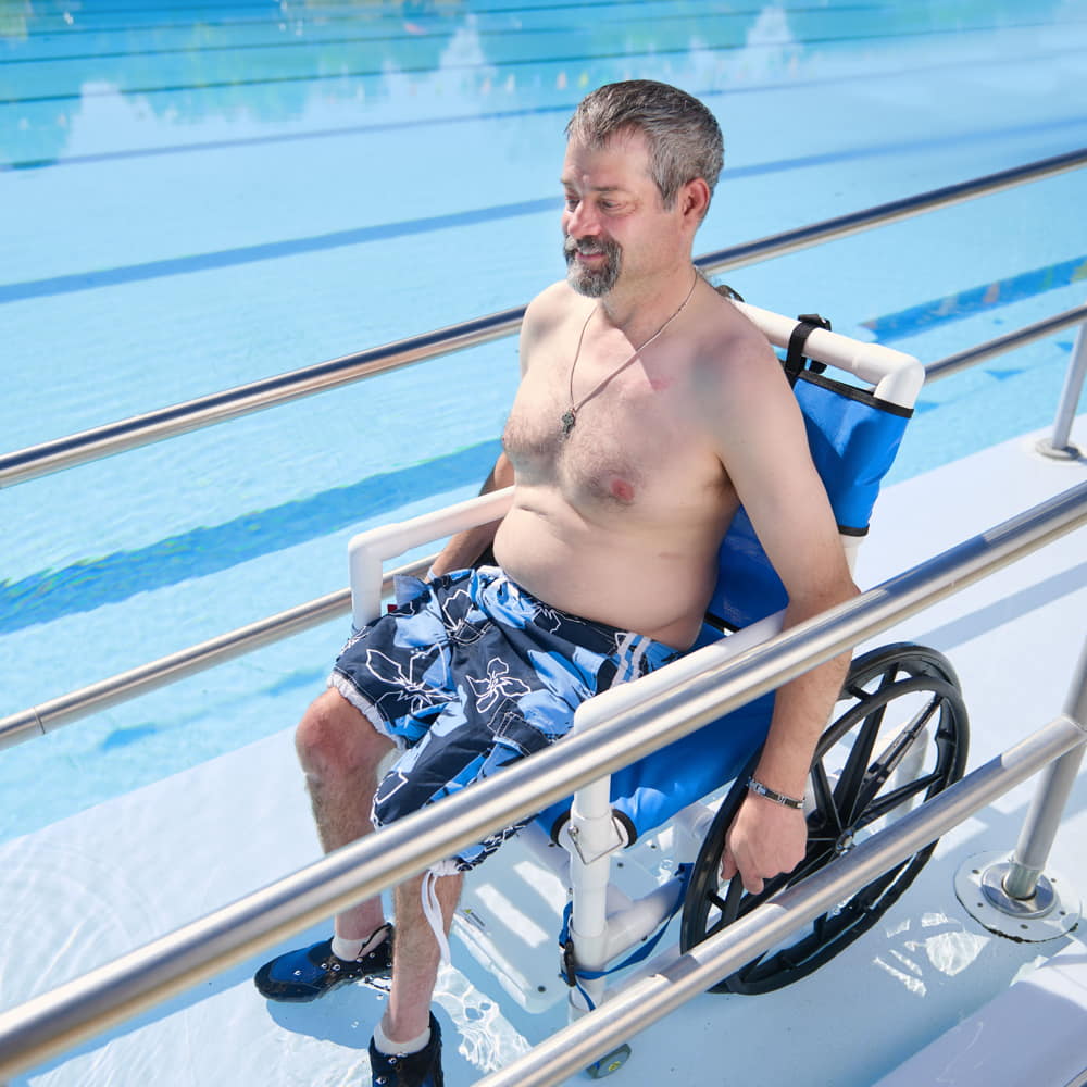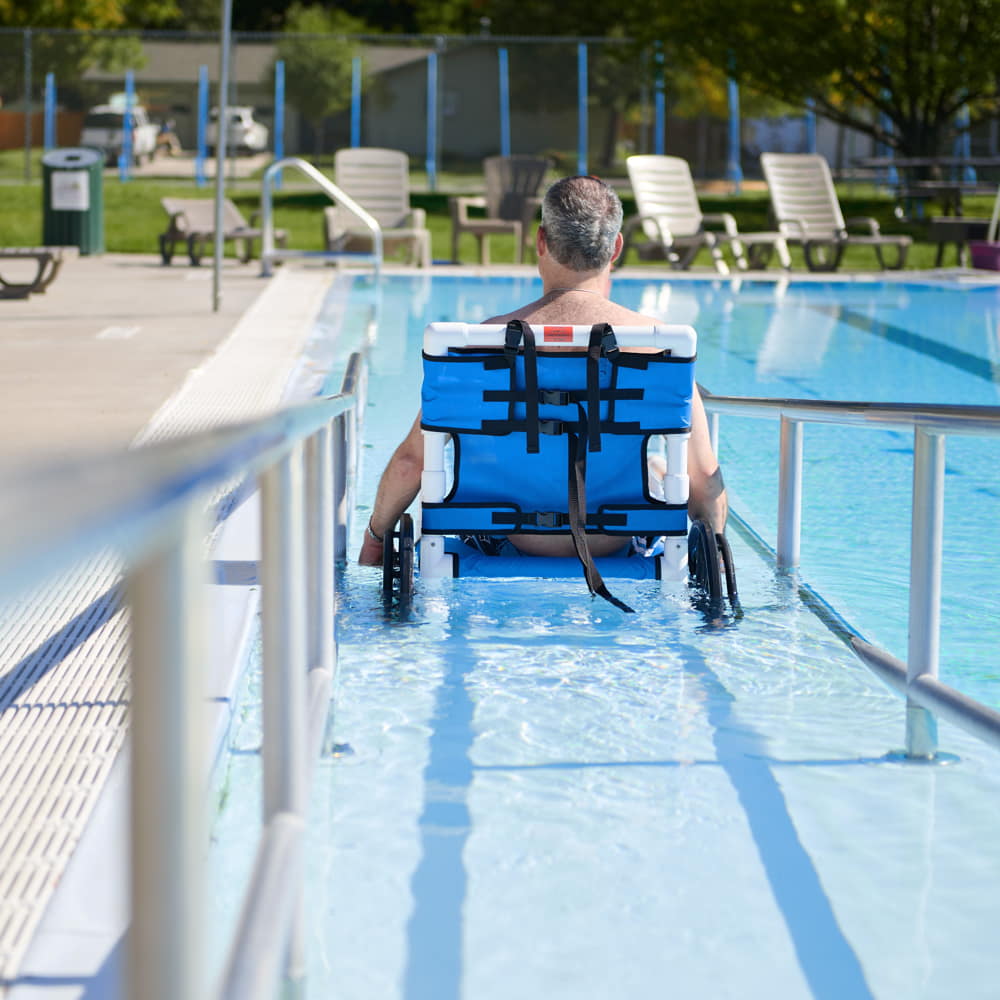Aqua Creek’s PVC pool access chairs are an economical choice for providing easier ADA access for sloped entries and ramps. The lightweight, durable construction makes these chairs an ideal solution for your facility. The PVC material is not only affordable and lightweight but resists corrosion. Their PVC pool access chairs are also great for use in locker rooms, showers, and other areas around your aquatic facility. Choose from three different sizes with mesh seats. These are only available in white PVC with blue mesh.