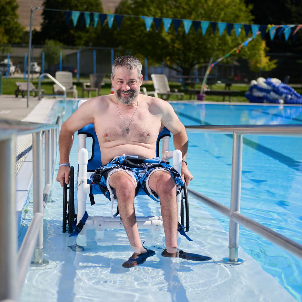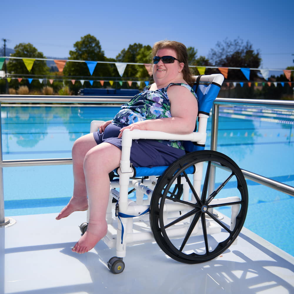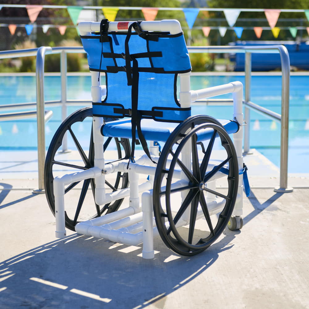 Aqua Creek’s PVC pool access chairs are an economical choice for providing easier ADA access for sloped entries and ramps. The lightweight, durable construction makes these chairs an ideal solution for your facility. The PVC material is not only affordable and lightweight but resists corrosion. Their PVC pool access chairs are also great for use in locker rooms, showers, and other areas around your aquatic facility. Choose from three different sizes with mesh seats. These are only available in white PVC with blue mesh.