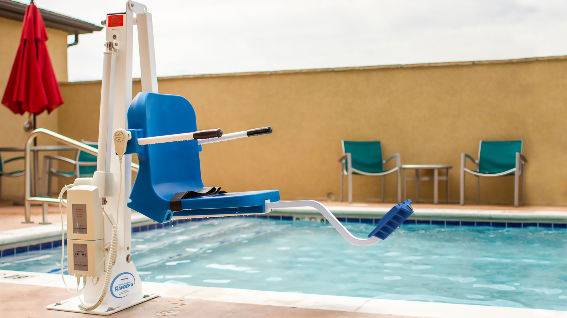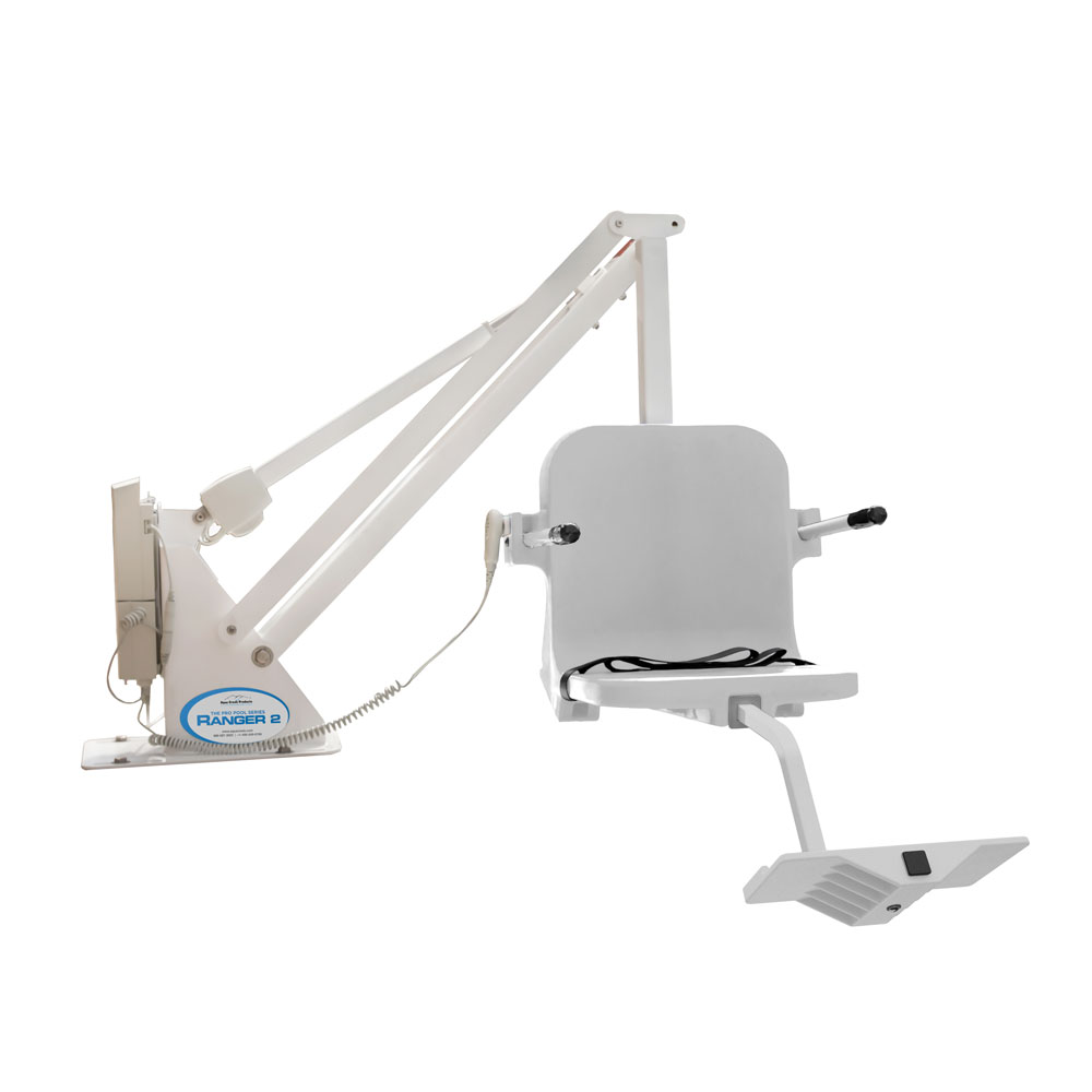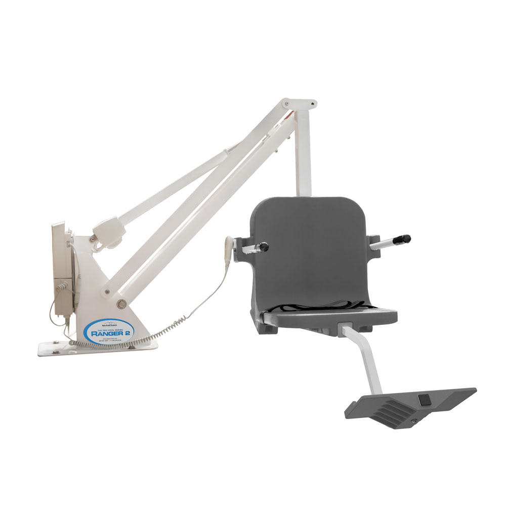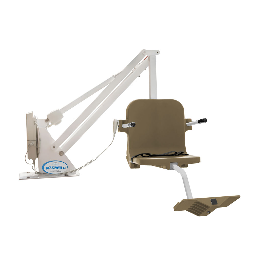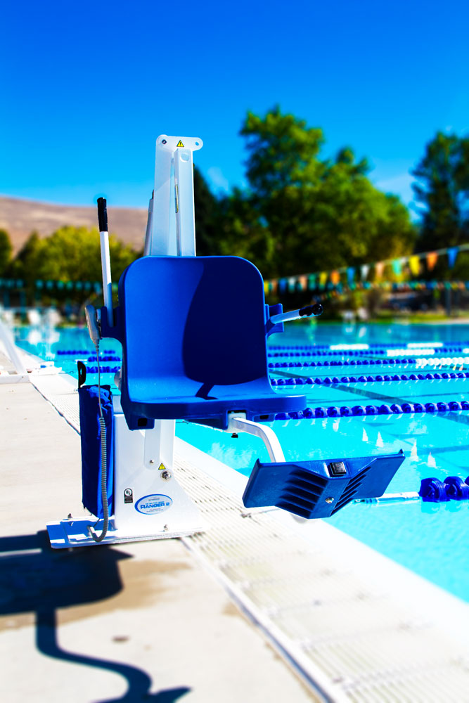 The Aqua Creek Ranger 2 lift is very affordable and is the perfect choice for most in-ground pools or spas. The Ranger™ 2 can be found in hundreds of hotels and motels as well as backyard pools throughout the world. This is a unique, non-rotating lift that also provides a low profile and small footprint making it an incredibly solid, durable, and reliable product that blends in with almost any décor. Users access their pools sitting in the seat parallel to the lift and side of their pool in a single out-and-down motion. This seating position, and the smooth motion into the pool, gives the user a greater feeling of security.
