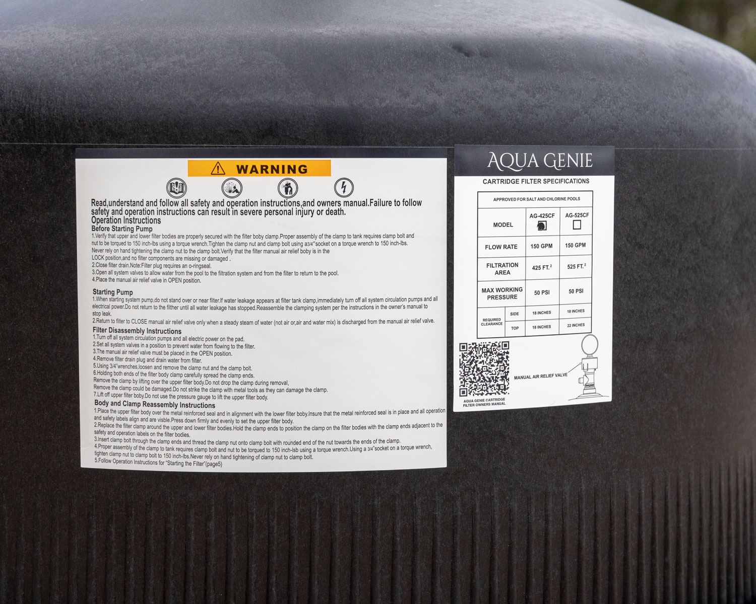 Experience the epitome of pool water purity with the Aqua Genie Cartridge Filter system! Designed to deliver exceptional filtration performance, the Aqua Genie Cartridge Filter is equipped with advanced technology that efficiently removes even the smallest particles, leaving your pool water sparkling clean and inviting. At the heart of the system are four high-efficiency filter elements, meticulously engineered to provide a total filtration area of 425 square feet. This generous filtration capacity ensures that debris, dirt, and contaminants are captured and trapped, leaving your pool water crystal clear and free from impurities.