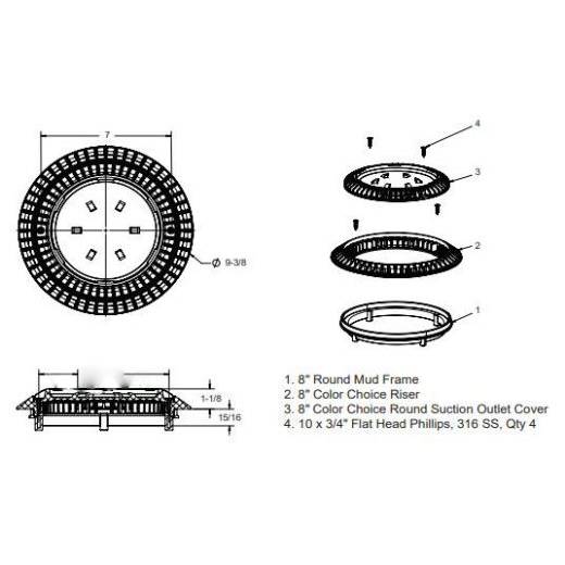 The AquaStar CC8108 Fits AquaStar standard 8″ models, American (Pentair), Color Match, Waterway, and most Custom Molded Products (CMP). At least two mud frame screws must be used to secure the cover.