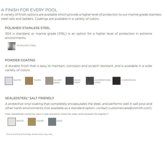 The Artisan Series Ladder is a patented, designer inspired ladder that provides an elegant custom look for any pool environment. This is the ideal choice for pool renovation projects, as the Artisan Series Hand Rail easily replaces a standard 24″ 3-step ladder. The rails are made with Stainless Steel with 1.90″ OD and a wall thickness of .065. The Steel is usually 304 grade but there is also a 316L Marine grade option available. For color options you have a Polished Stainless Steel look, a Powder Coated look in White, Taupe, and Rock Gray. For your anchors S.R. Smith recommends to use the Universal Plastic Deck Anchor 2 Pack.