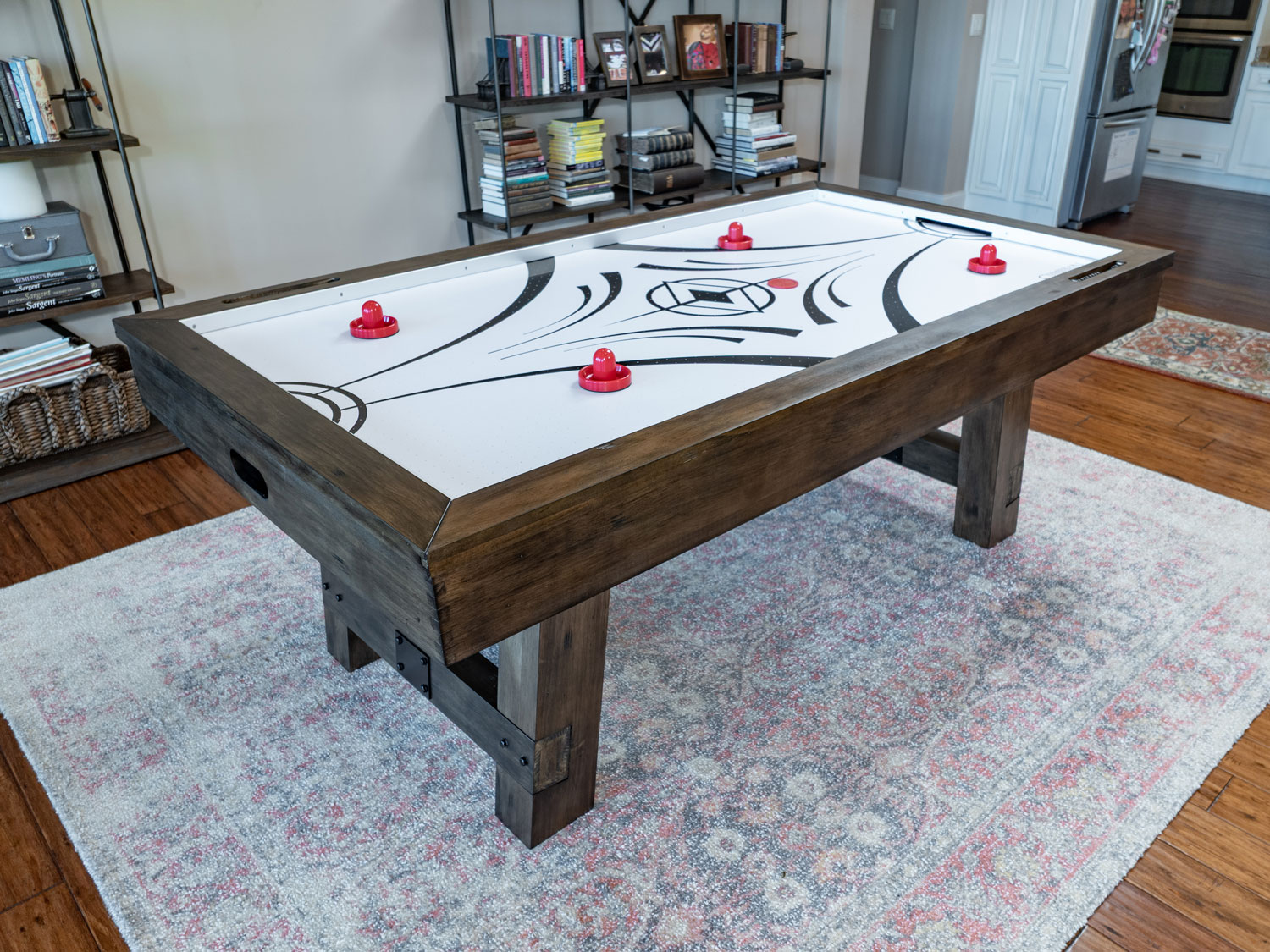 The Aspen Nights Distressed Wood Air Hockey Table was meticulously designed and built with style in mind. From the unique hand distressed wood finish to the designer inspired playing surface this table was designed to not only function as an air hockey table but to also add a touch of style to your home. The design features continue with the center stretcher bar for support and Craftsman-inspired dovetail finished corners. This design inspired Air Hockey table is guaranteed to provide hours of family fun and excitement!