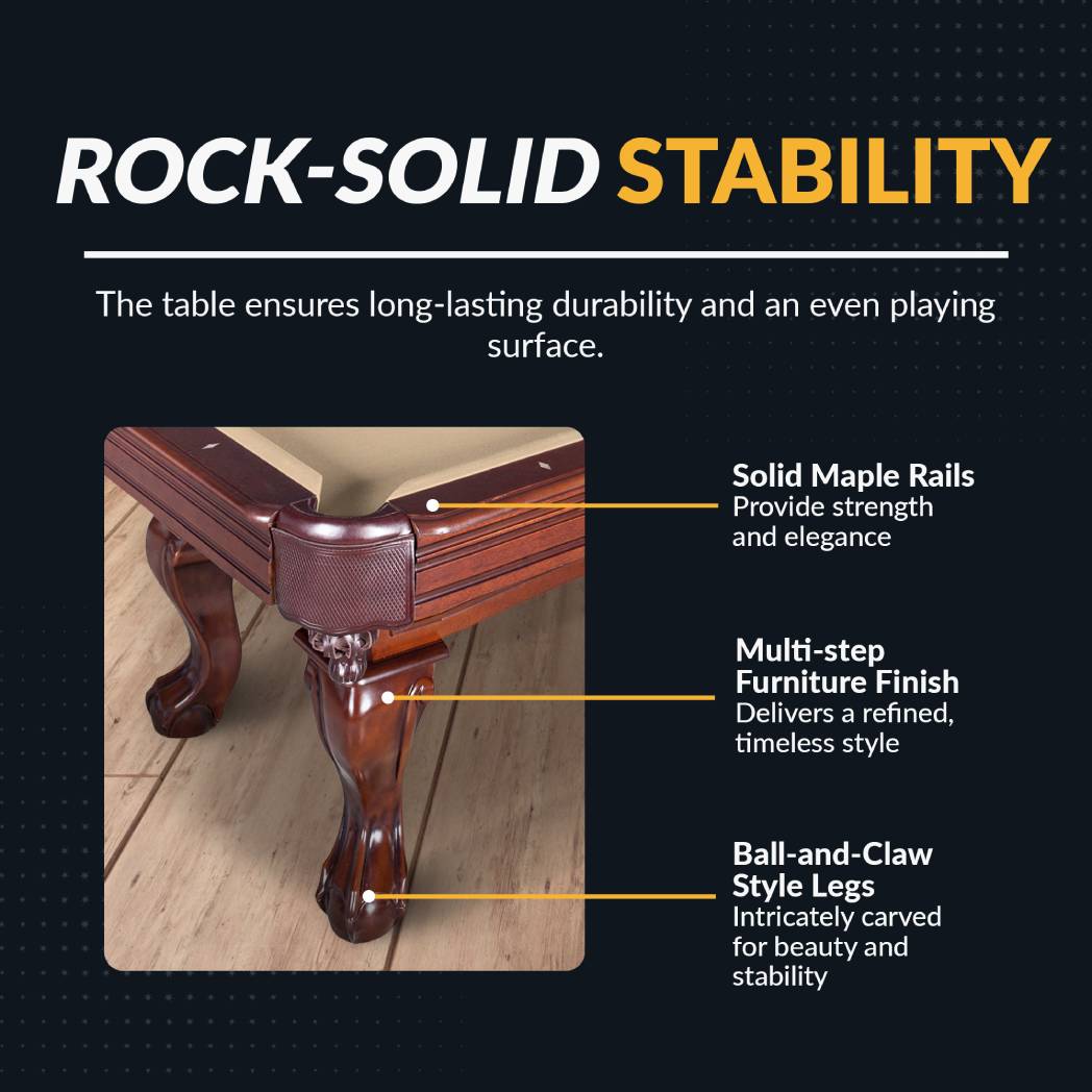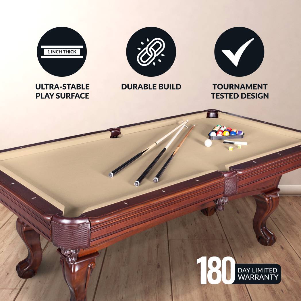The Augusta Augusta 8 Ft Non-Slate Pool Table in Walnut was designed to please even the most discriminating interior designers, showcasing traditional style and superior craftsmanship. The table cabinet is crafted from 1-in thick engineered MDF material covered in a maple veneer; finger jointed interlocking interior support beams and perimeter anchor blocks deliver – rigid – rock-solid table stability. The 4.5- in solid Maple top rails featuring beautifully inlaid diamond sights and exclusive turbo-speed tournament tested K-66 profile gum rubber cushions provide active table play.