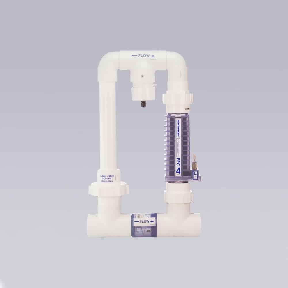 AutoPilot’s patented Bypass Manifold is a pre-assembled unit designed to control the flow rate delivered to our cell. The spring check valve in the manifold allows excess flow, over 20 gpm, to bypass the cell. The water in turn flows at a controlled rate through the cell where it is super chlorinated. The inline strainer on the inlet side of the manifold protects the Tri-Sensor and production cell from debris that might bypass the filter. The location of the strainer next to a connection union makes periodic cleaning easy.