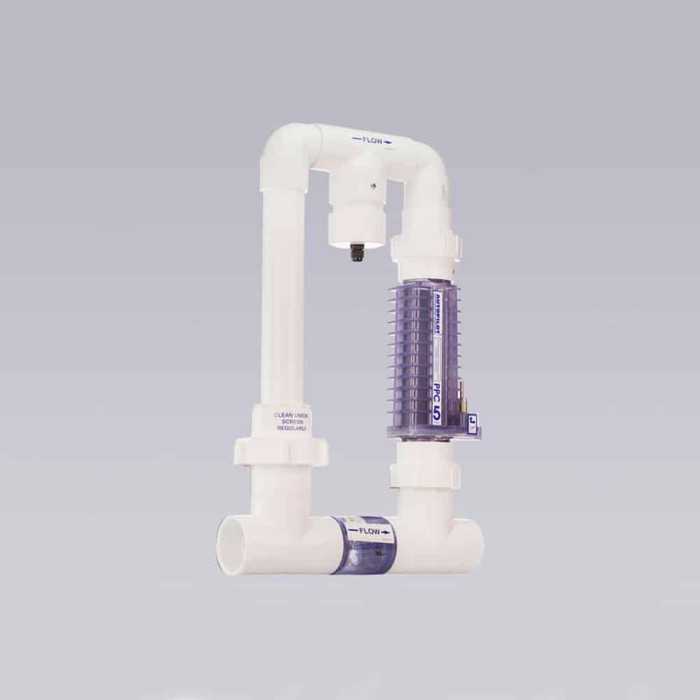 AutoPilot’s patented Bypass Manifold is a pre-assembled unit designed to control the flow rate delivered to our cell. The spring check valve in the manifold allows excess flow, over 20 gpm, to bypass the cell. The water in turn flows at a controlled rate through the cell where it is super chlorinated. The inline strainer on the inlet side of the manifold protects the Tri-Sensor and production cell from debris that might bypass the filter. The location of the strainer next to a connection union makes periodic cleaning easy.