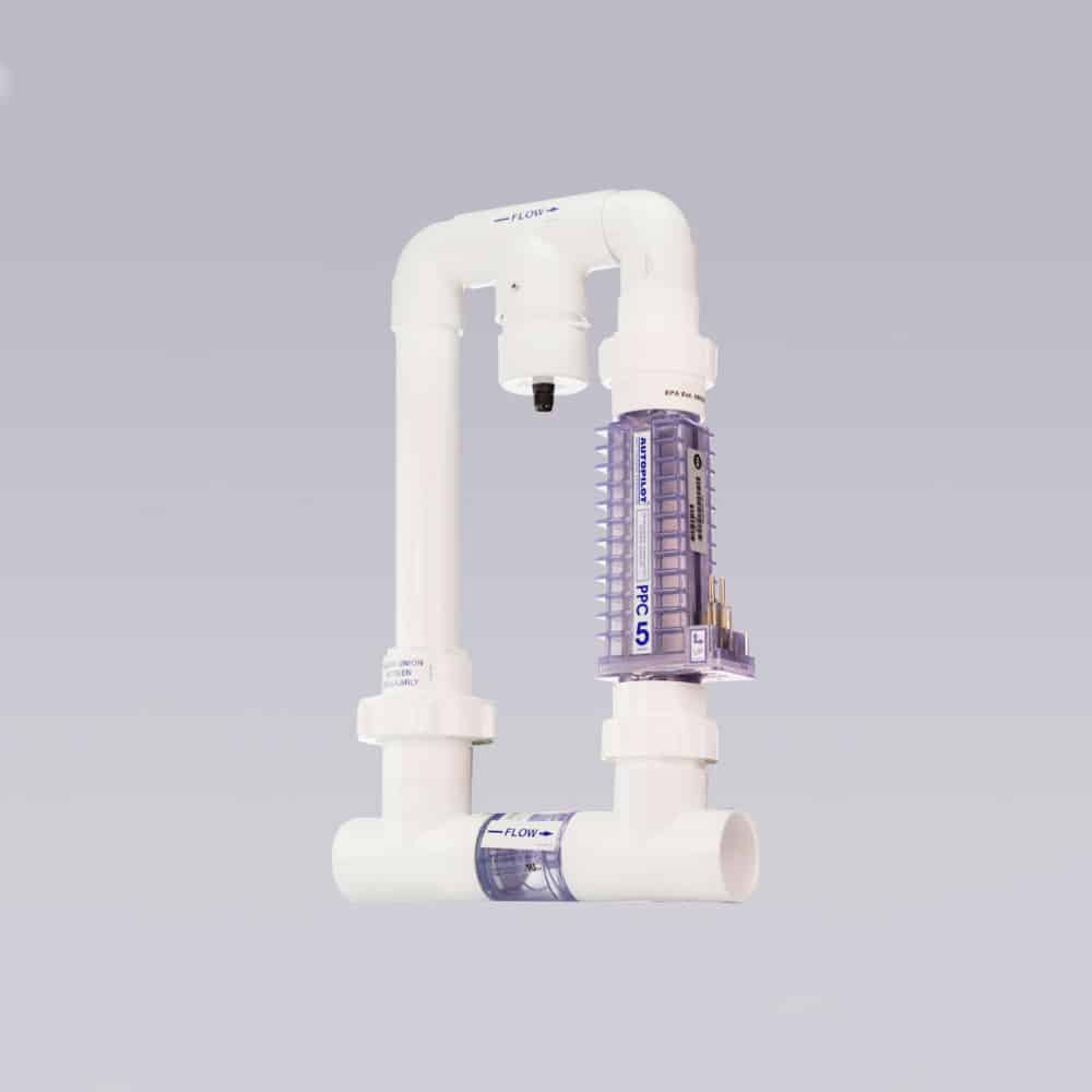 - Check Valve – The check valve in the Manifold allows all water flowing through the plumbing at a rate greater than 20 gallons per minute to by-pass the production cell to maximize the production of chlorine.