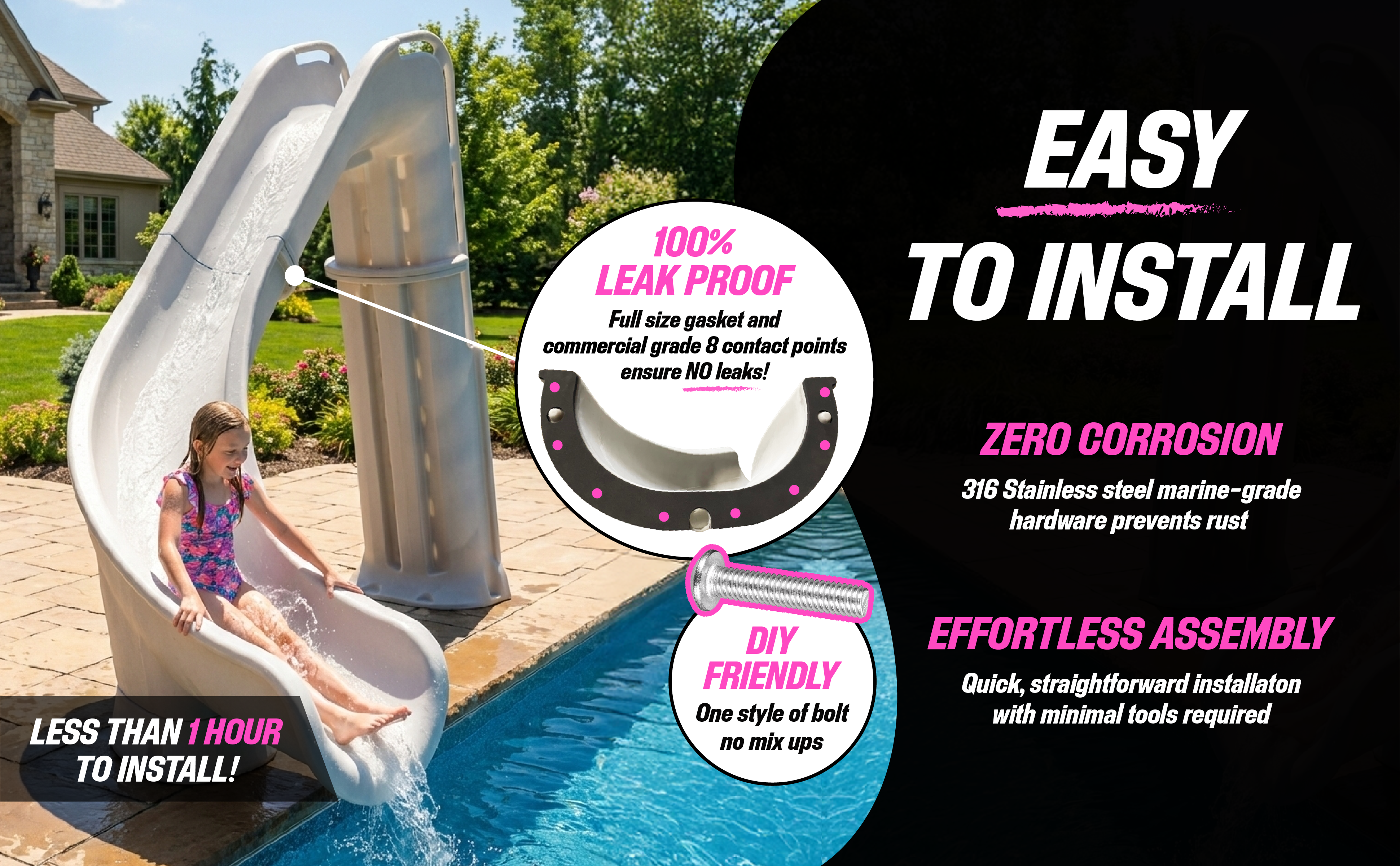 Constructed from UV-stabilized polyethylene, this slide is engineered to withstand prolonged sun exposure, pool chemicals, and outdoor conditions while maintaining its color and structural integrity over time. Thoughtful safety elements, including slip-resistant steps, durable handrails, and full ASTM compliance, ensure confident use for swimmers of all ages. The Bad Axe delivers family-friendly excitement with the reliability and quality expected from a premium pool slide.