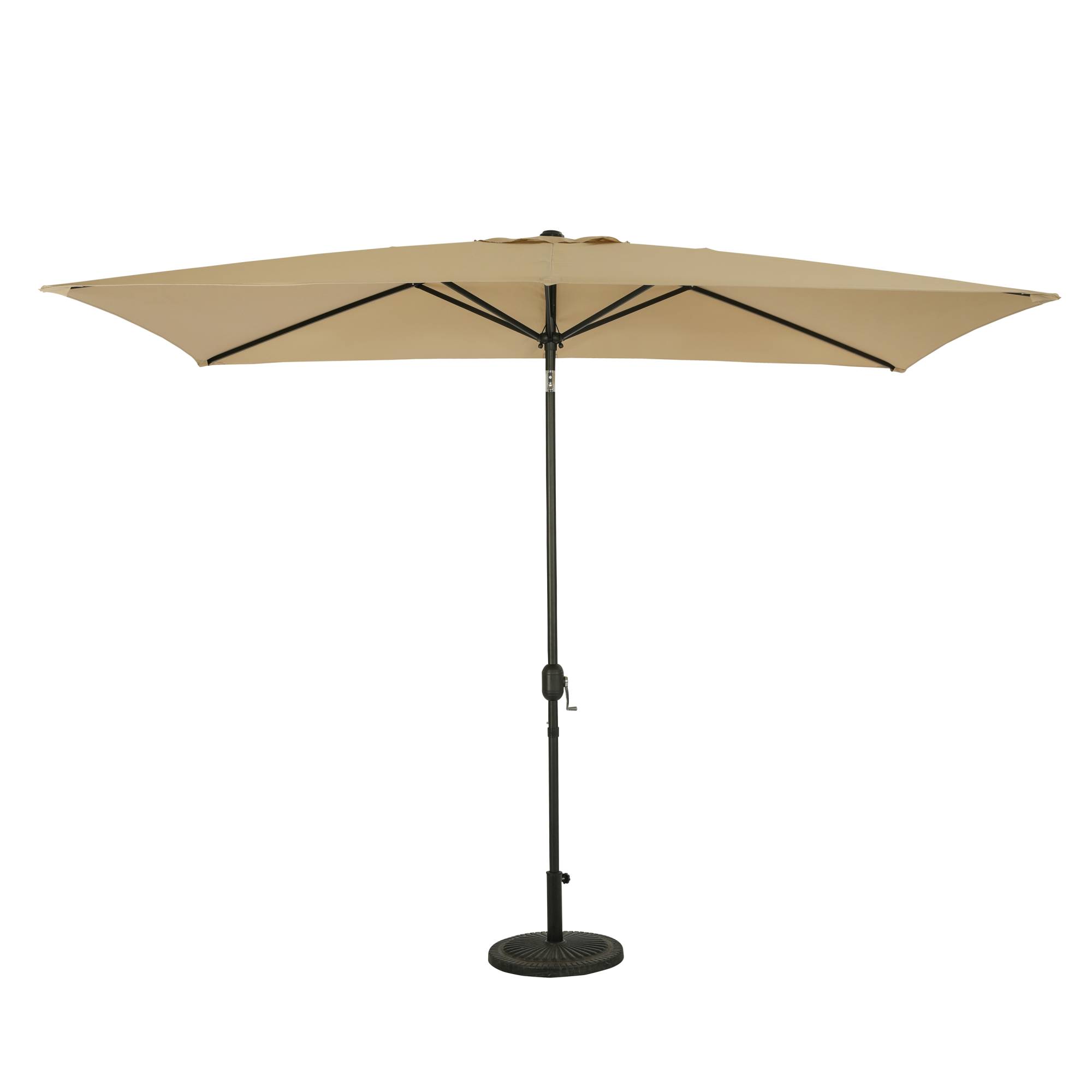 The Bimini 6.5′ x 10′ Rectangle Umbrella provides a smart and stylish way to shade your oval tables all summer long. This umbrella is designed for easy operation. Simply turn the crank handle until the canopy is completely open, then push-to-tilt the canopy to obtain your desired shade. The durable rust-resistant steel pole with the convenient push-to-tilt feature has a rich bronze-colored finish. The 6-rib canopy is covered in weather and fade-resistant polyester fabric and sports a single wind vent that allows air to escape freely and limits wind damage. Polyester fabric canopy backed with a 1 year warranty; 1 year warranty on pole and structure. Base sold separately.