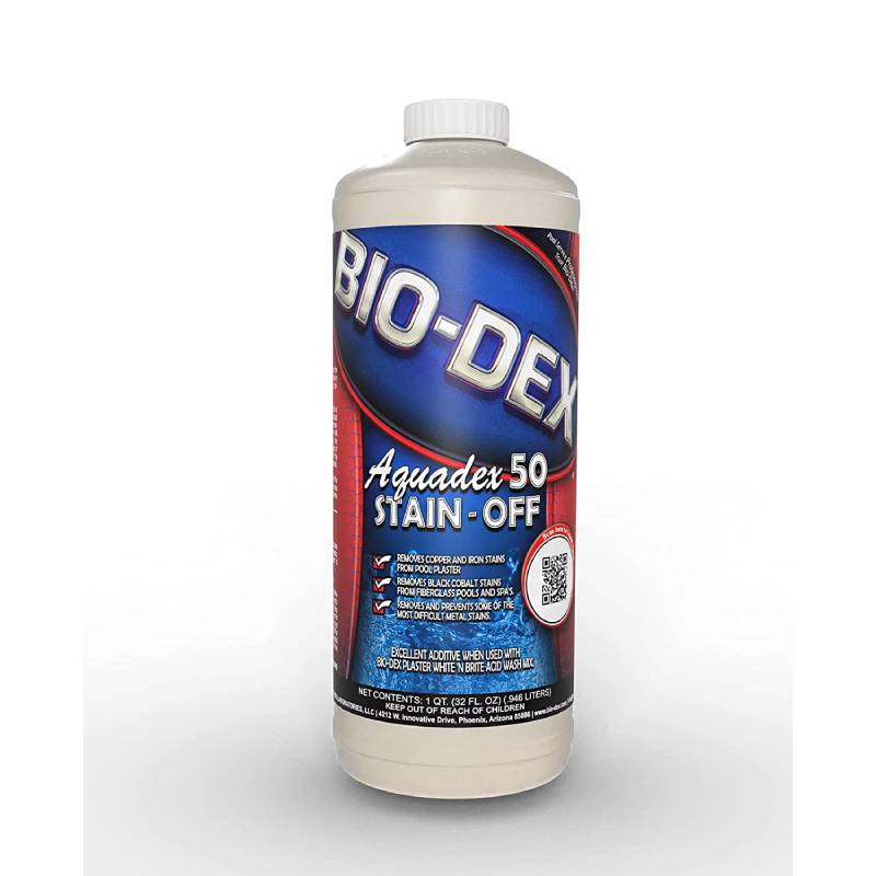 The Biodex Aquadex 50 Stain-Off is a powerful aid in the removal of metal stains and scales such as copper, iron, and cobalt that have accumulated in both pools and spas. This concentrated liquid is stable at high temperatures and is unaffected by chlorine, acids, or other sanitizing chemicals.