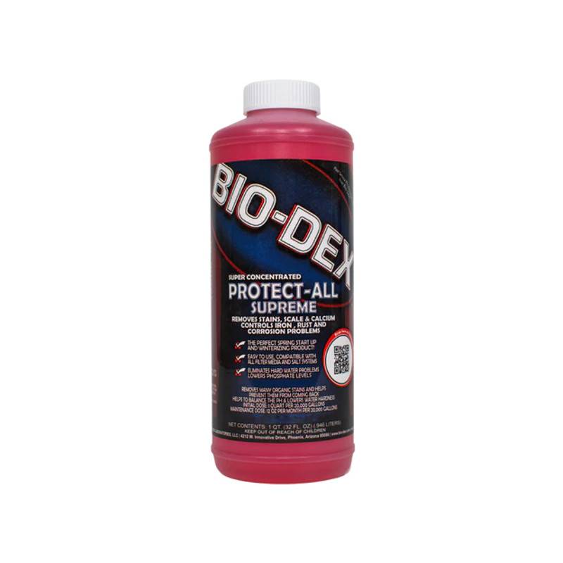 The Biodex PAO32 Protect All Supreme; 1 qt .This is the product of choice in areas with hard water problems. It removes many types or organic stains and combined with Aquadex 50 Stain Off will remove 98% of all types of surface stains. The product is an effective tool for new pool startups, newly filled pools, spring pool startup, seasonal winterizing and ongoing maintenance. Protect All Supreme can also be used on spas, hot tubs and decorative pools.