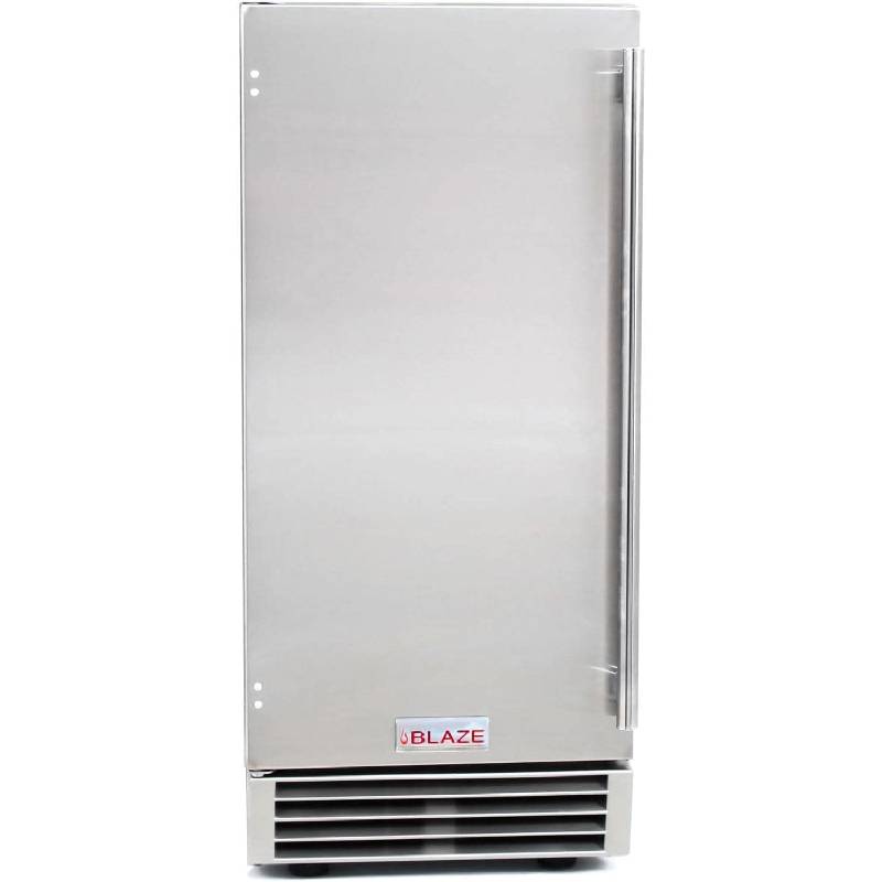 The Blaze 50 Lb. 15-Inch Outdoor Rated Ice Maker With Gravity Drain – BLZ-ICEMKR-50GR. Outdoor Ice Makers & Ice Machines. Outdoor entertaining is more enjoyable and convenient when you have everything in your outdoor kitchen. This outdoor ice maker eliminates unnecessary trips inside to get ice for your beverages. The unit is made from durable stainless steel and features a reversible door to suit your specific needs. The Blaze outdoor ice maker can produce up to 50 pounds of cube ice per day and can hold 25 pounds in its removable bin. Inside the ice maker, a cool blue LED illuminates the contents, making things easy to see. The ice maker also includes a self cleaning mode and convenient one button operation. The Blaze ice machine features an in-line water filter which filters out impurities, ensuring the ice production is free of contaminants. The front venting design allows it to be used in a built-in application, or it can be used as a freestanding unit. The bottom of the ice maker is equipped with four leveling legs for a perfect fit. It operates on environmentally friendly R134a refrigerant, carries an Energy Star rating and UL listing for outdoor use. This ice maker includes a stainless steel ice scoop, drain line and water line.