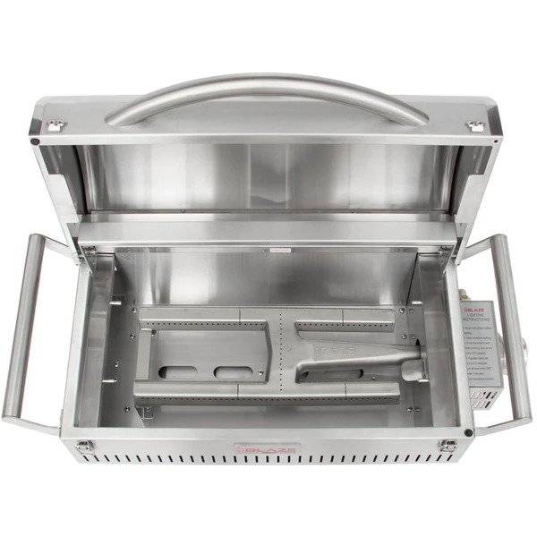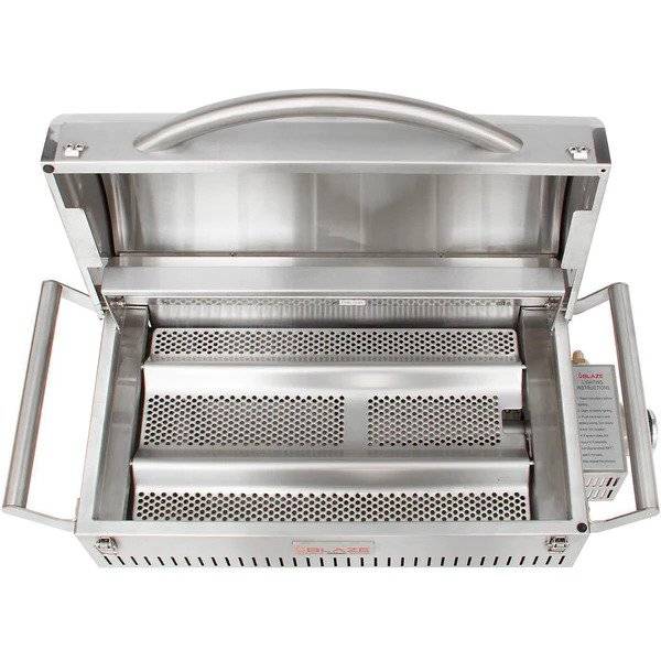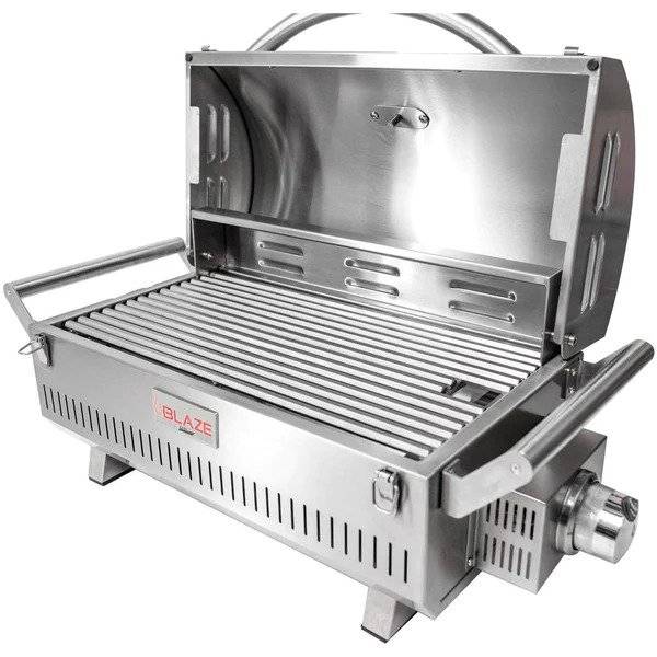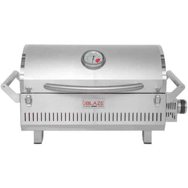 The Blaze Professional Marine Grade Portable Grill allows people to bring the power and quality of Blaze Grills offshore. The Professional Portable Grill utilizes all of the same commercial-grade components of the Blaze Professional Series built-in grills. This portable powerhouse has a marine grade, 316L stainless steel exterior and uses a 12,000 BTU cast stainless steel H-burner and 12-gauge stainless steel flame tamer to reach incredibly even heat.
