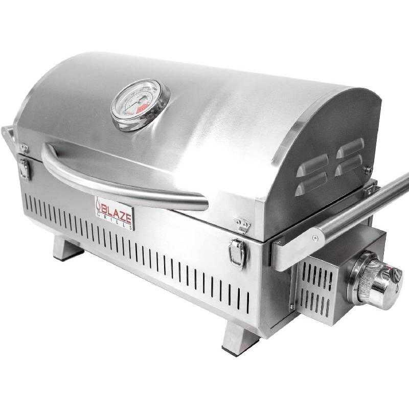 The Blaze Professional LUX Portable Grill allows people to bring the power and quality of Blaze Grills on the road. The Professional LUX Portable Grill utilizes all of the same commercial-grade components of the Blaze Professional LUX Series built-in grills. This portable powerhouse has an all 304 stainless steel construction and uses a 12,000 BTU cast stainless steel H-burner and 12-gauge stainless steel flame tamer to reach incredibly even heat. The heavy-duty 12mm hexagon, stainless steel cooking rods helps you achieve extraordinary searing temperatures, maximizes the durability of this grill and provides 201 square inches of grilling area. The push and turn flame-thrower primary ignition ensures a steady, reliable flame with every start. For when the grill is not in use, the lid can be locked shut with two front-facing clasps. This grill is designed to use a 1 Lb propane cylinder or a 20 Lb tank with the included tank adapter.