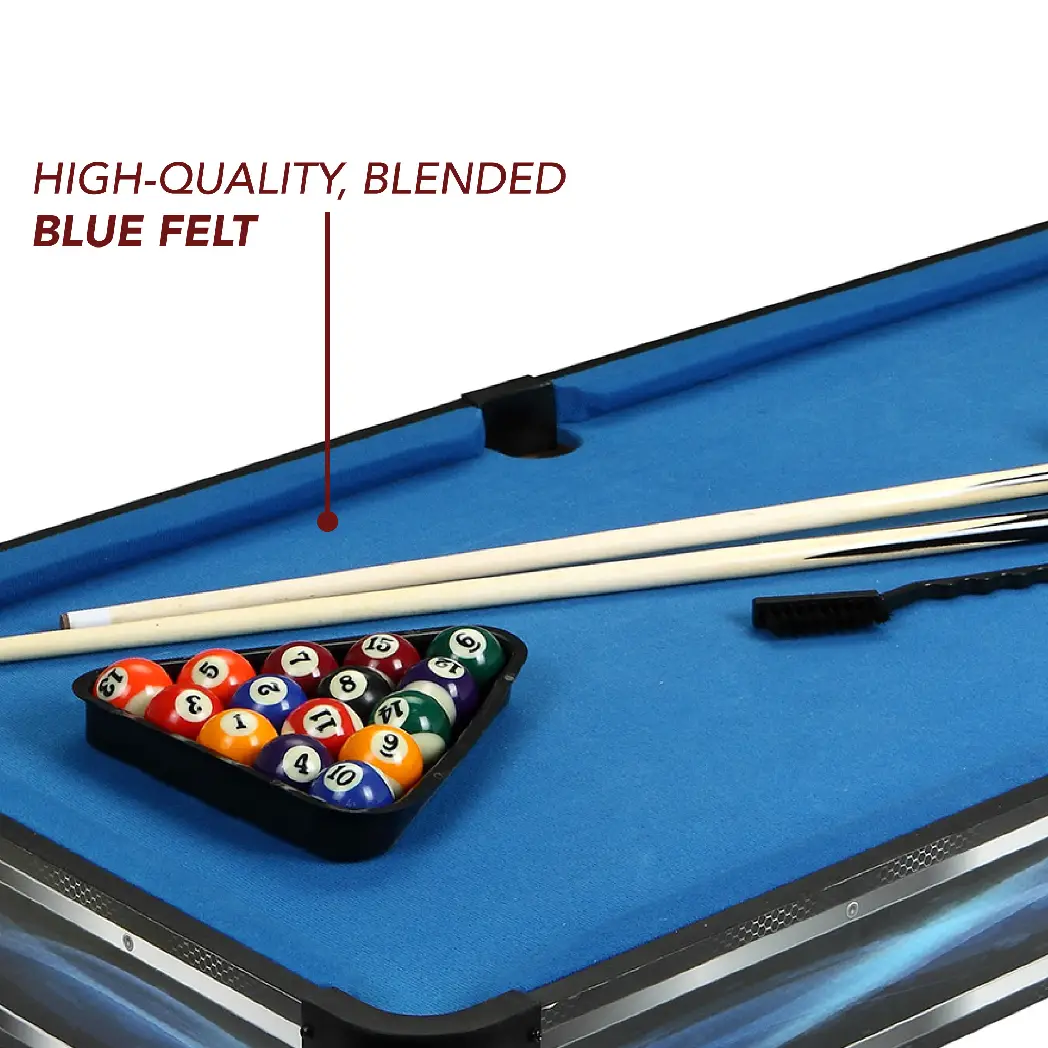 - Blended, polyester/wool blue felt give this pool table a classic billiards feel that will delight your friends and family