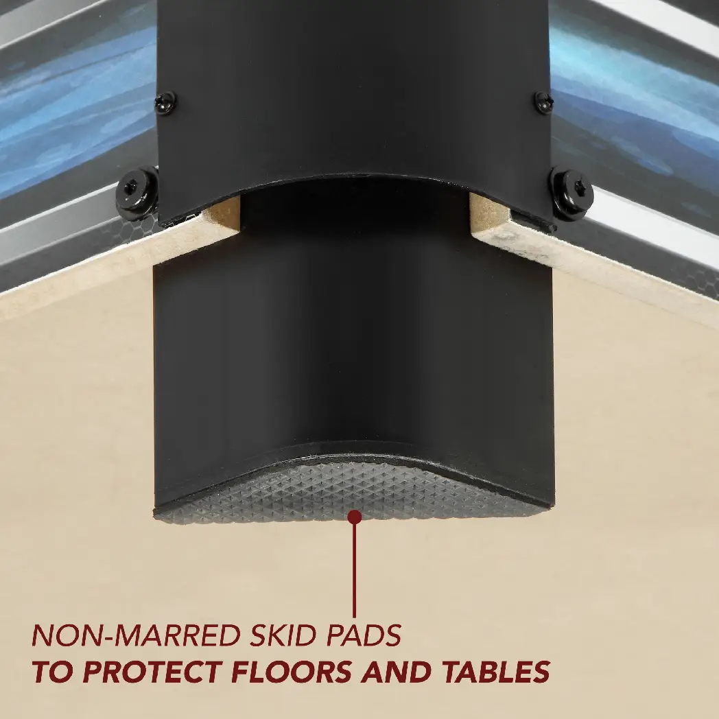 - Included, no-mar skid pads protect floors and tables from scratches