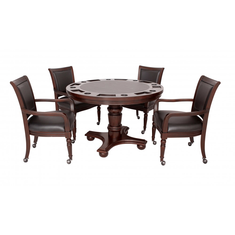 Invite friends and family over for a game night with the Bridgeport Poker Game Table set. The set includes the 2-in-1, 48″ diameter game table with 4 matching chairs. The reversible dining table surface quickly turns into a felt-lined game table surface with an easy flip of the tabletop. The poker surface has space for 8 players and includes built-in drink holders and chip slots. The extremely comfortable, soft, padded game chairs add the finishing touches to this multi-functional table set. The Bridgeport set is crafted from hardwood and MDF CARB certified material finished in a beautiful furniture quality Walnut finish.