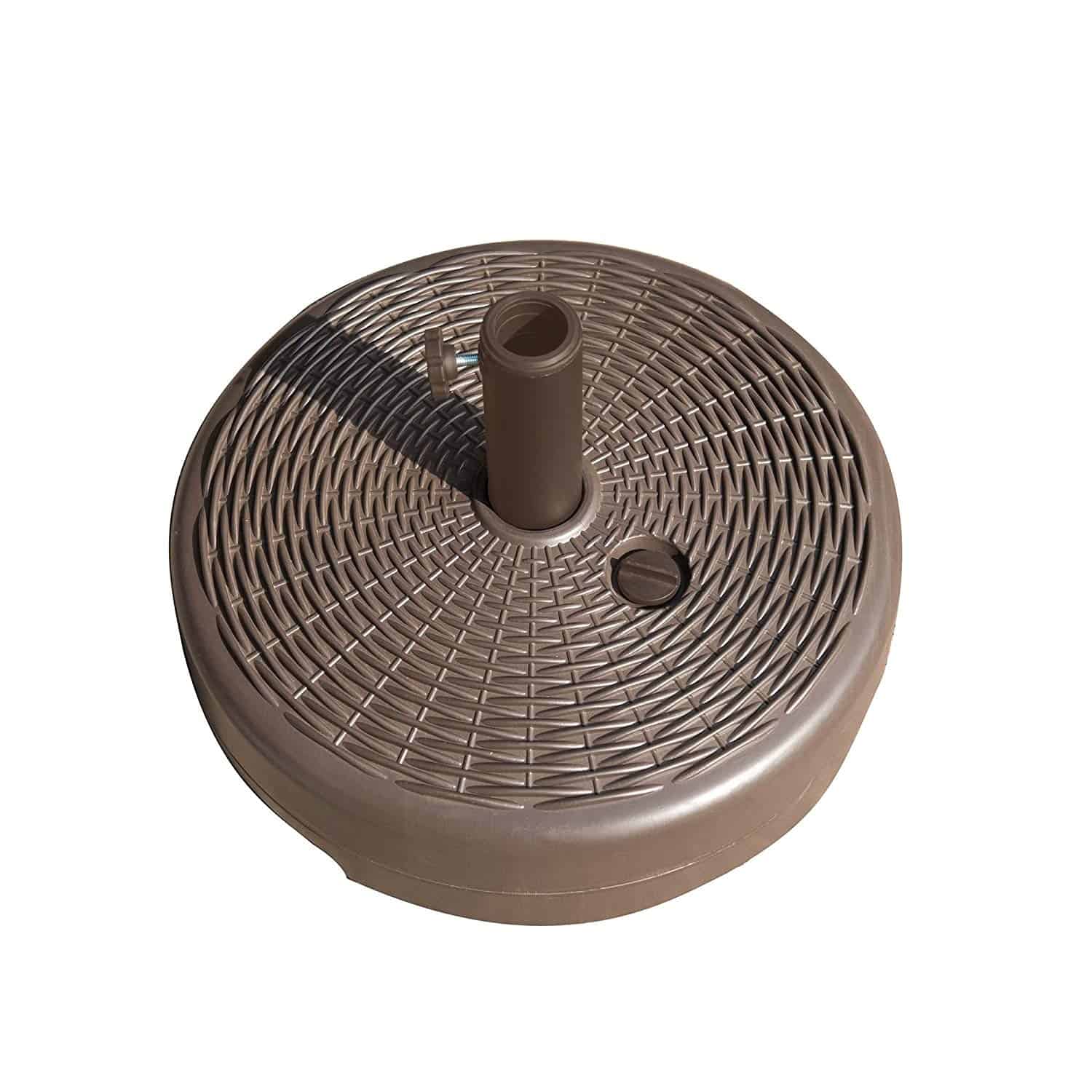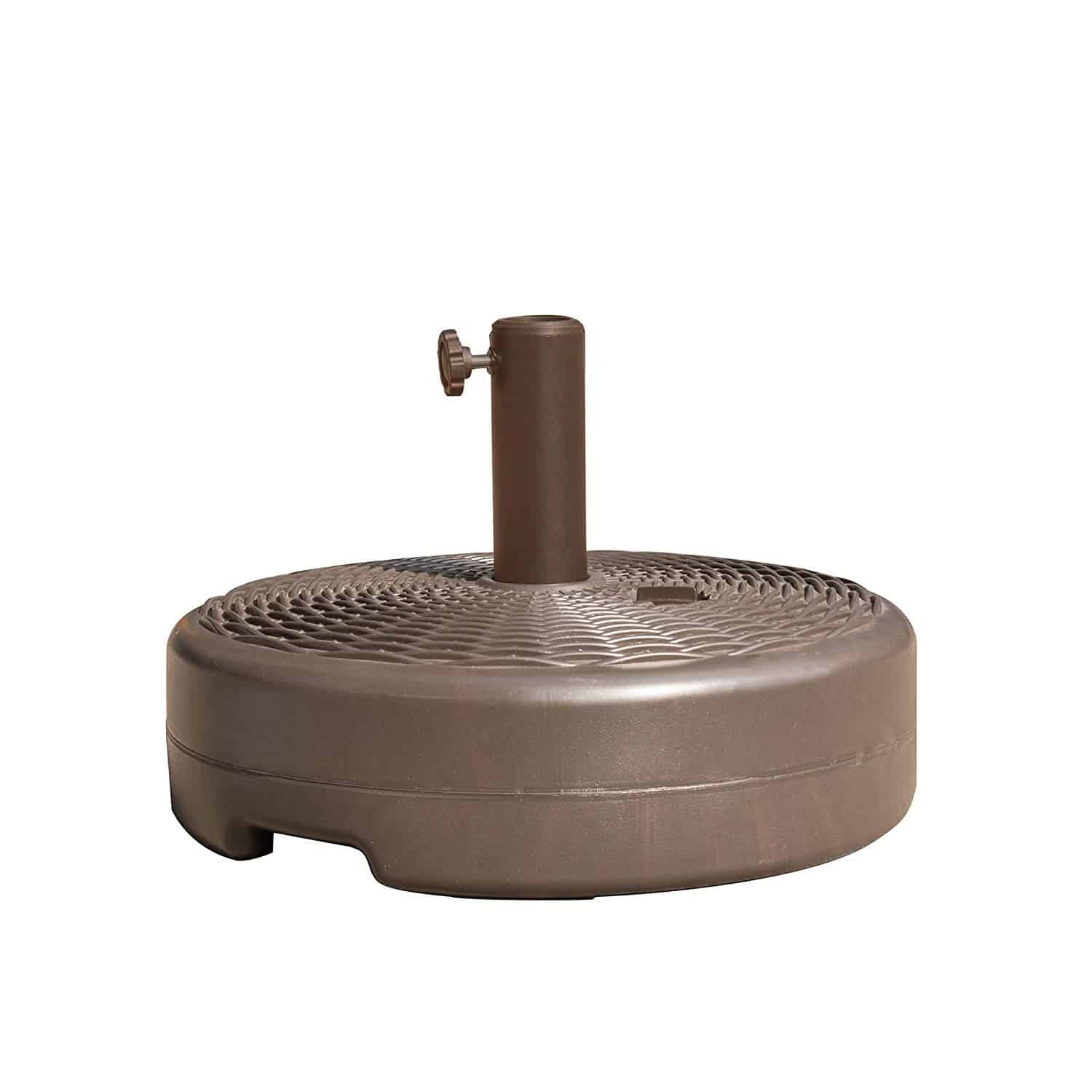 Turn your patio or deck into a relaxing oasis with the Bronze Fillable Base For 7.5-ft Umbrella. This durable, fillable base features a stylish, wicker weave pattern that makes an exquisite addition to your patio or yd umbrella. Designed to work with both freestanding umbrellas or under a patio table, this base fits anywhere you want your umbrella to be. Filling the base with water is easy. Once full, this handsome stand weighs 37.5 lbs, keeping your umbrella stable & secure. & for extra safety, the base has a built-in anchoring knob to keep the umbrella in place. When winter approaches, the water is easily drained. The included, rip-resistant bag makes storage a snap. Capable of supporting umbrellas 7.5′ or less with a pole diameter of 1.5 – 1.9 in, this umbrella base provides dependable, high-class style. Base dimension: 18-in D x 5.7-In H. Water reservoir: 4.5 gallons of water weight with water: 37.5-Lbs