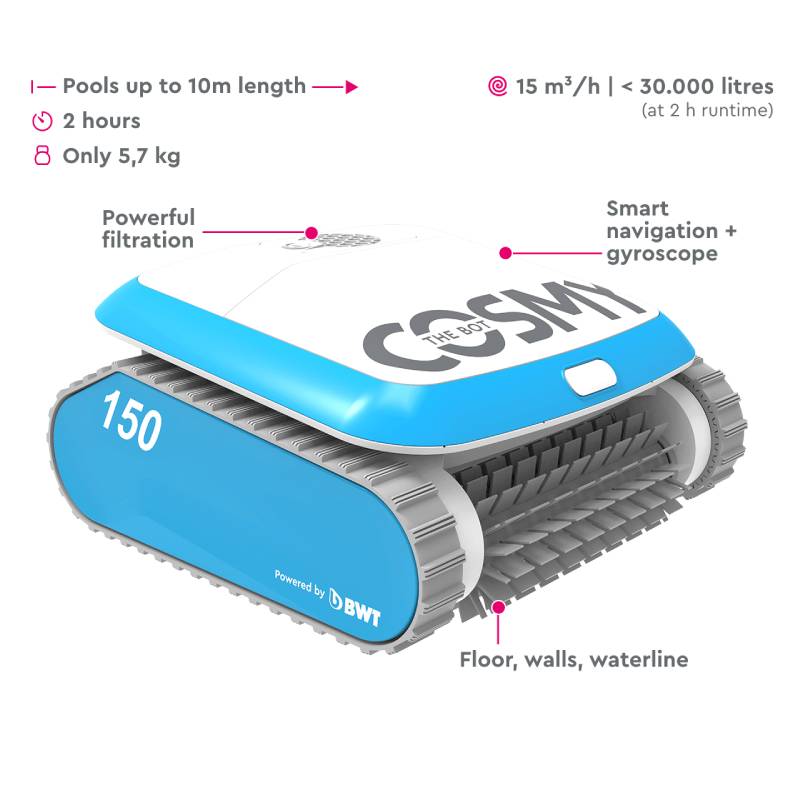 With the BWT LB150, you enter a new world where efficiency meets style and elegance, where size is replaced by finesse and intelligence. Light, strong, intuitive – that describes the models perfectly. With a height of about 20 cm and an advanced algorithm for detecting objects, the COSMY can detect and avoid obstacles such as ladders, pool covers, etc. in good time. The smallest particles (up to 150 microns) can be caught in the mesh filter basket. Over 800 g of dirt particles can be collected in one cleaning cycle.