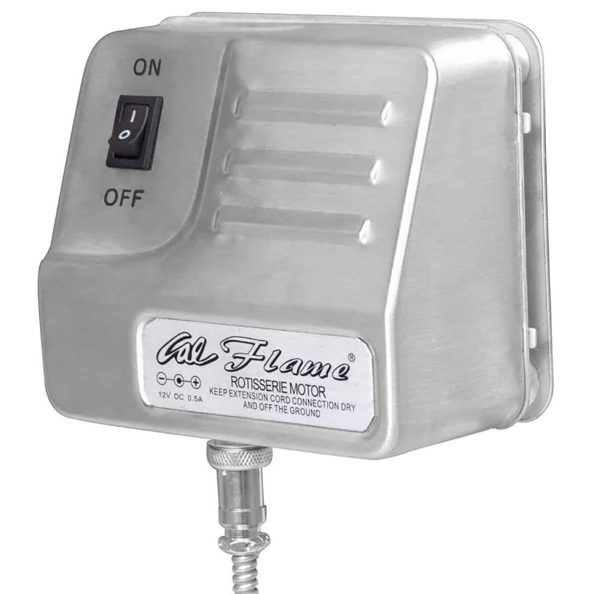 Enjoy the full bodied taste of rotisserie cooking with the Cal Flame 12-Volt Rotisserie Motor that mounts on left or right side of Cal Flame Grills. Imagine cooking entire hens on the rotating spit, utilizing the powerful 11000-BTU back burners of select Cal Flame gas grills. Your friends and family will love your outdoor roasted foods.