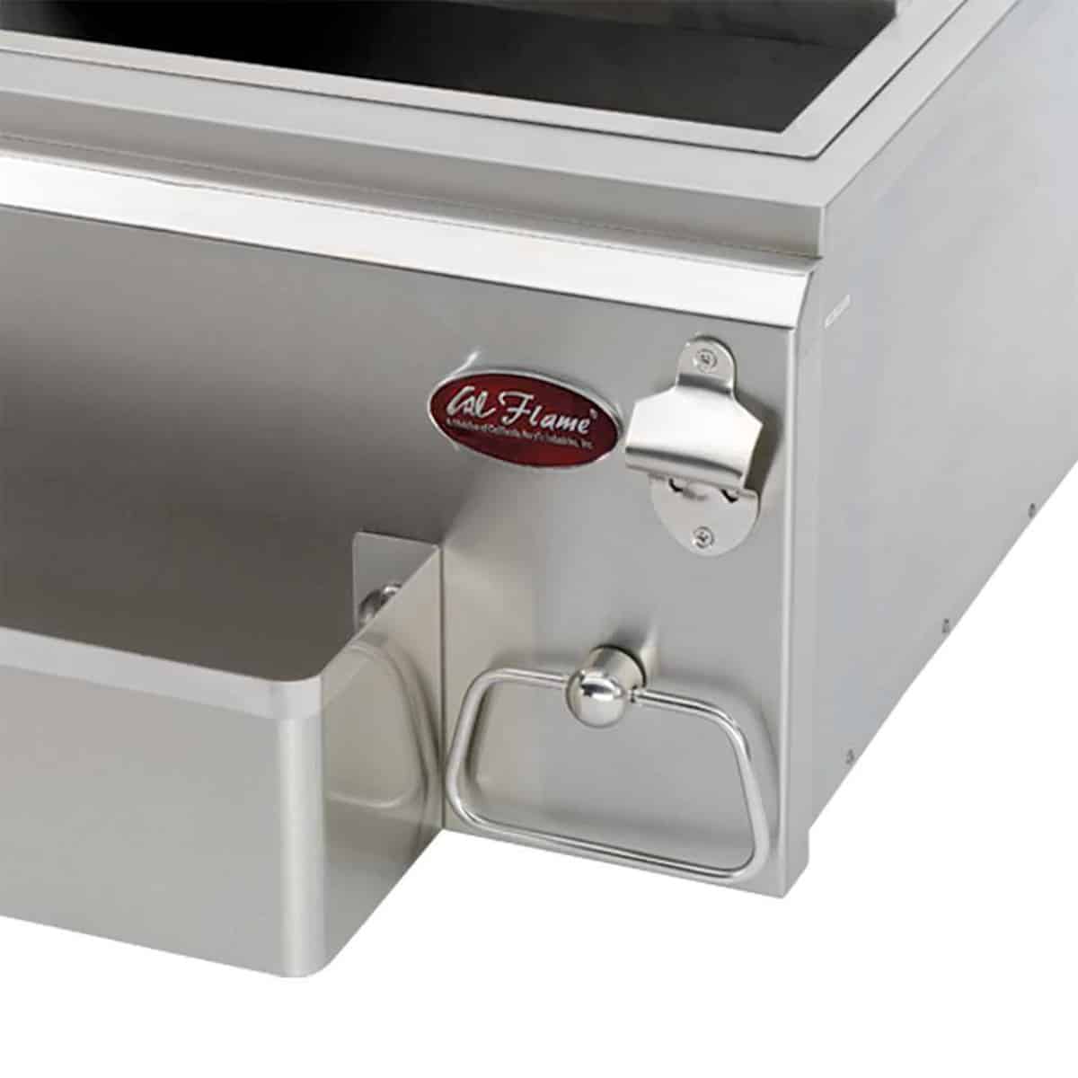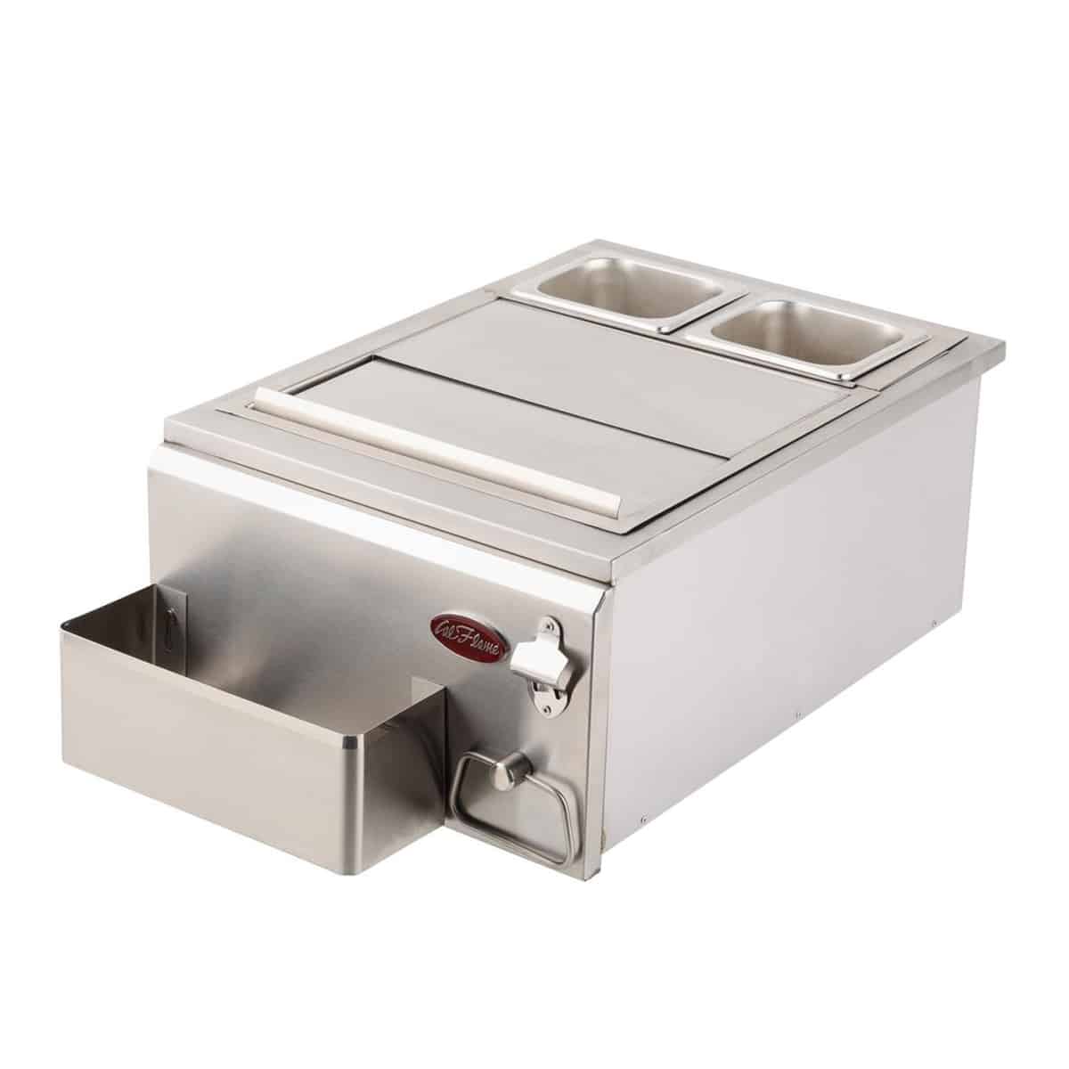 Keep ice in the outdoor kitchen cold with a Cal Flame 18″ Built-In Cocktail Center. Two condiment trays can keep favorite garnishes chilled and fresh for guests. A towel rack and bottle opener make tending bar a tidy task. It’s an insulated cooler that conveniently holds ice, condiments and ice scoops. Includes two dishwasher safe condiment trays.