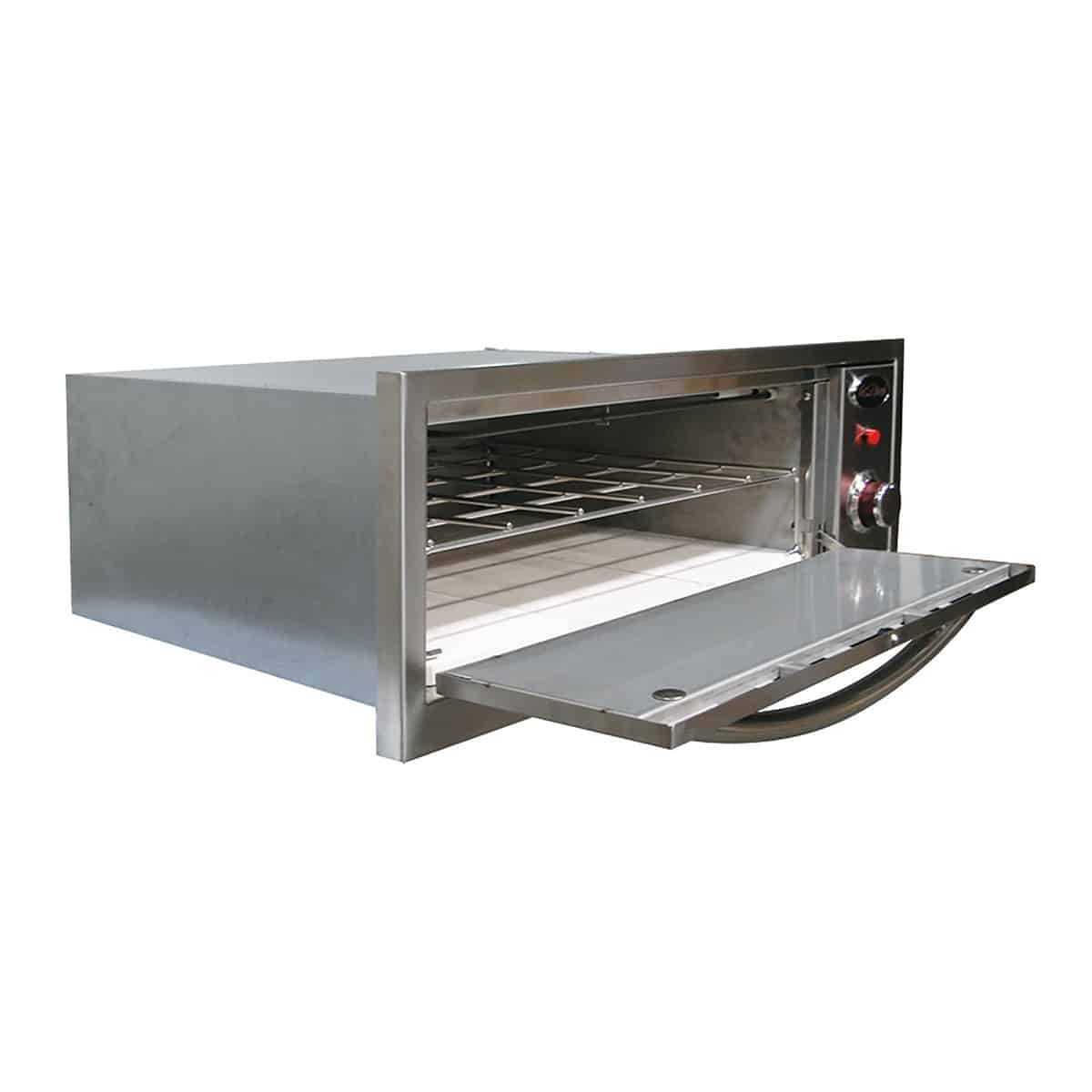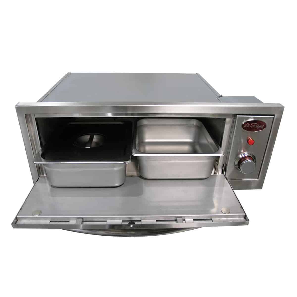 The Cal Flame 2-in-1 Built-In Warming / Pizza Oven includes Pizza Brick includes a Pizza Brick, 2 Stainless Steel Serving Pan w/Cover and removable rack. Simplify your life with the Cal Flame 2-in-1 Oven-Warmer and Pizza Oven. This versatile oven is the ideal solution to increasing your cooking options. Durable, all stainless steel seamless construction and a solid, uni-body, double-layer design mean that this oven will last through the toughest cooking conditions. The lasting design of this oven is maintained with the added advantage of exclusive, heavy duty Cal Flame knobs. The pull-out warming rack includes a stone for authentic-tasting pizza and the 2 full-size trays with covers and handles make serving your best meal a breeze.
