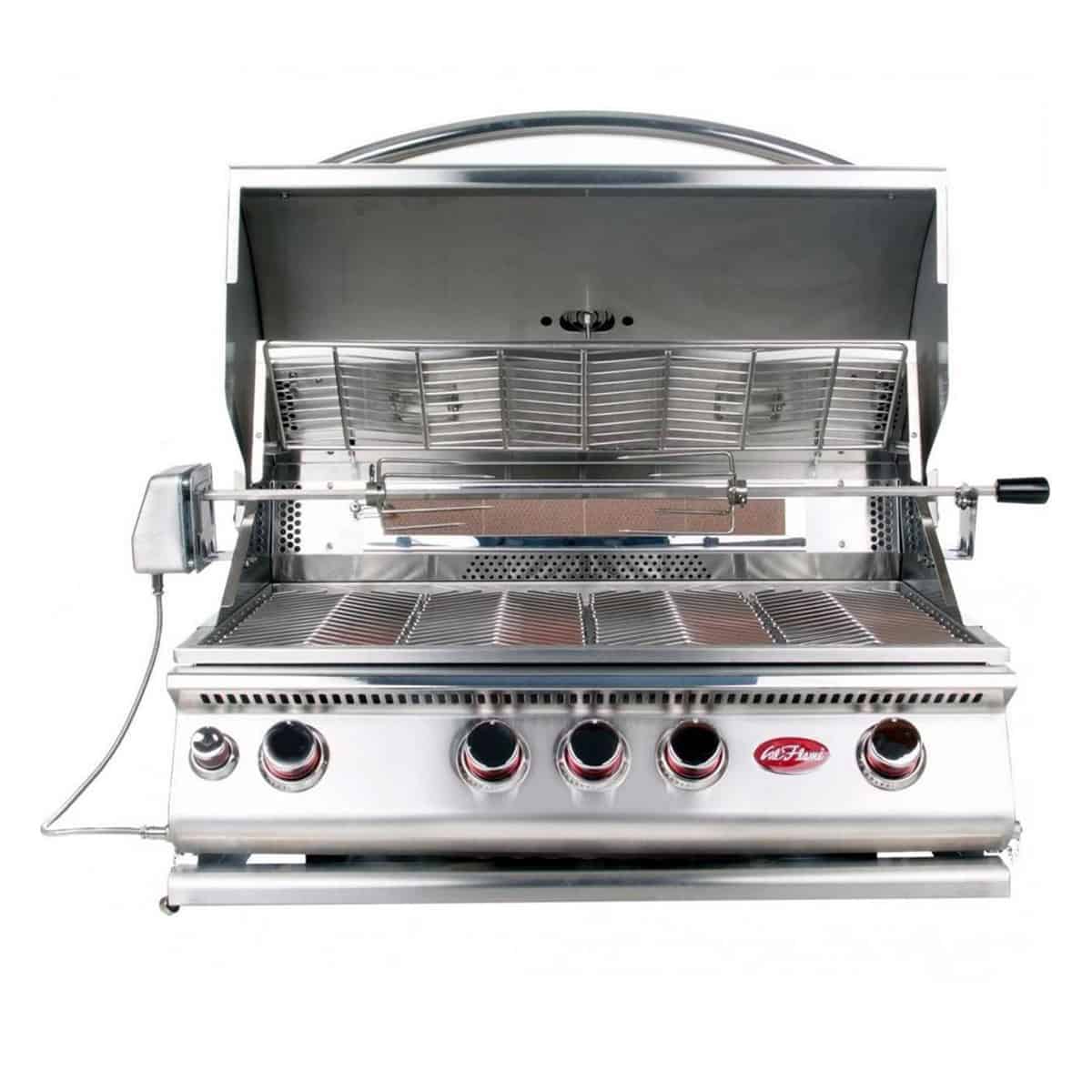 The Cal Flame Built-In 4 Burner Convection BBQ Grill offers exclusive convection technology on a roomy 4-burner grill. Solid 304-stainless steel burners emit 75,000 BTU and have a one year warranty. The infrared back burner is perfect for a rotisserie. Get gourmet results with 50% quicker grilling!