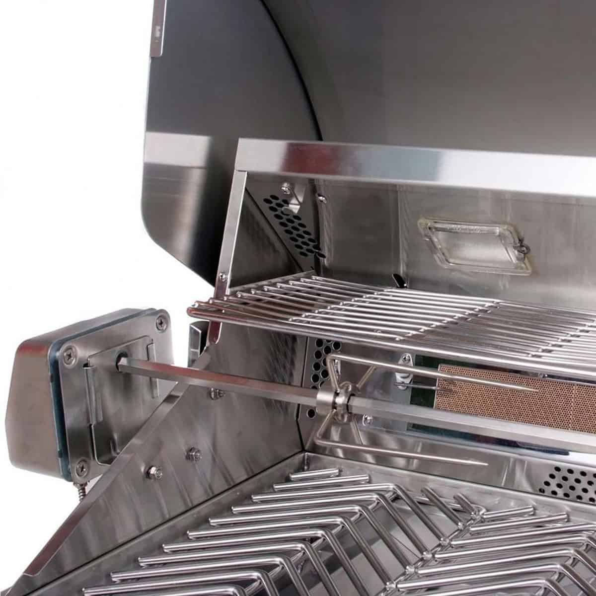 | Dual Halogen Interior Lights | Rotisserie with Adjustable Motor Mount | Exclusive Knobs with multi-colored LED Bezels | Griddle Tray |