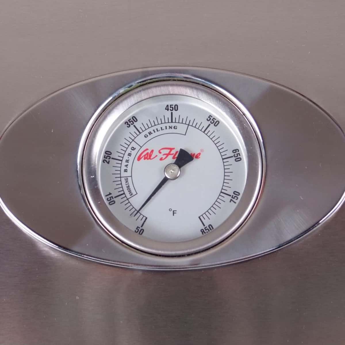 | Built-In Extra Large Temperature Gauge | Removable Heavy-Duty V-Shaped Cooking Grate | Full-Width Stainless Steel Drip Tray on Rollers | C-Smoker Box |