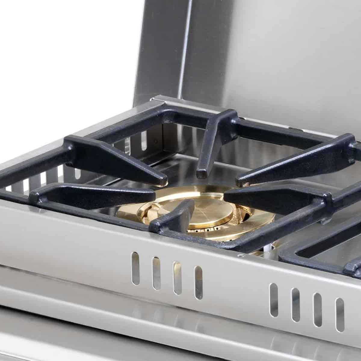 Maximize outdoor kitchen counter space with a Stainless Steel 30,000 BTUs Built-In Stainless Steel Cal Flame Deluxe Drop-In Side by Side Double Burner. The deluxe double side-by-side burner is designed to fit snuggly in the island while protecting the counter space. With both burners up front, there is reduced burn risk when reaching over the front burner. Constructed of 430-Grade stainless steel for years of outdoor use.