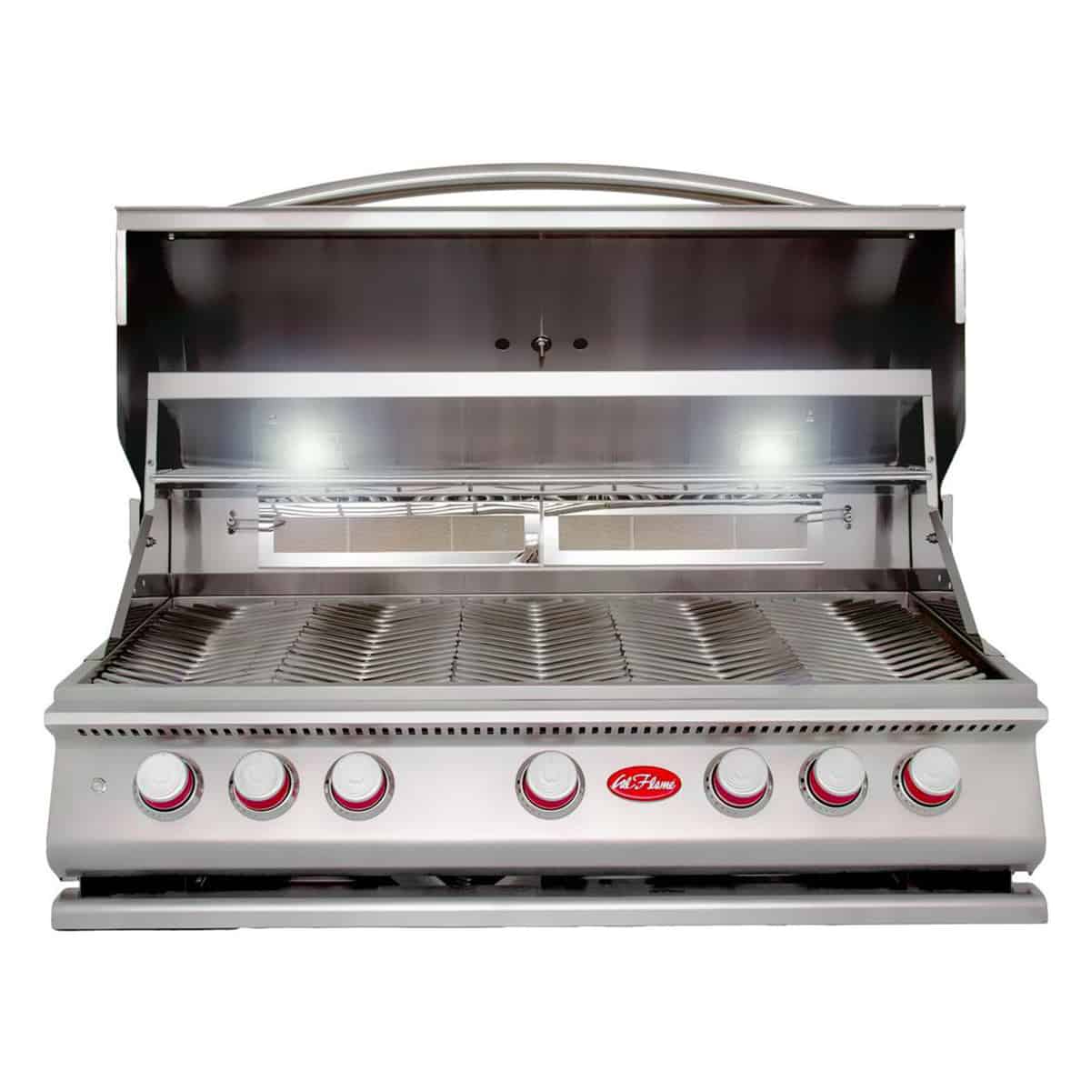 The Cal Flame P Series Built-In 5 Burner BBQ Grill is the perfect pro-style grill for your outdoor environment. This Cal Flame 40-inch Grill is constructed with 304 Stainless Steel which features Five (5) 15,000 BTU cast Stainless Steel Burners each with independent easy start ignition, 95,000 BTU overall, 1,000 sq.in. cooking surface, Interior Lights for night time grilling, 110V Full Size Rotisserie, Griddle, Smoke Box, Lip Guards on all burners to prevent clogging, 5 Exclusive Heavy Duty V-grates, Full width Warming Rack with two positions, Thermometer that lets you monitor the temperature at all times, Full Width Drip Tray, Black Cover, Liquid Propane (LP) or Natural Gas (NG), and Exclusive Heavy Duty Cal Flame Knobs. This grill allows any burner to be switched out with an optional Sear Zone Burner or Smoke Tray for enhanced grilling alternatives.