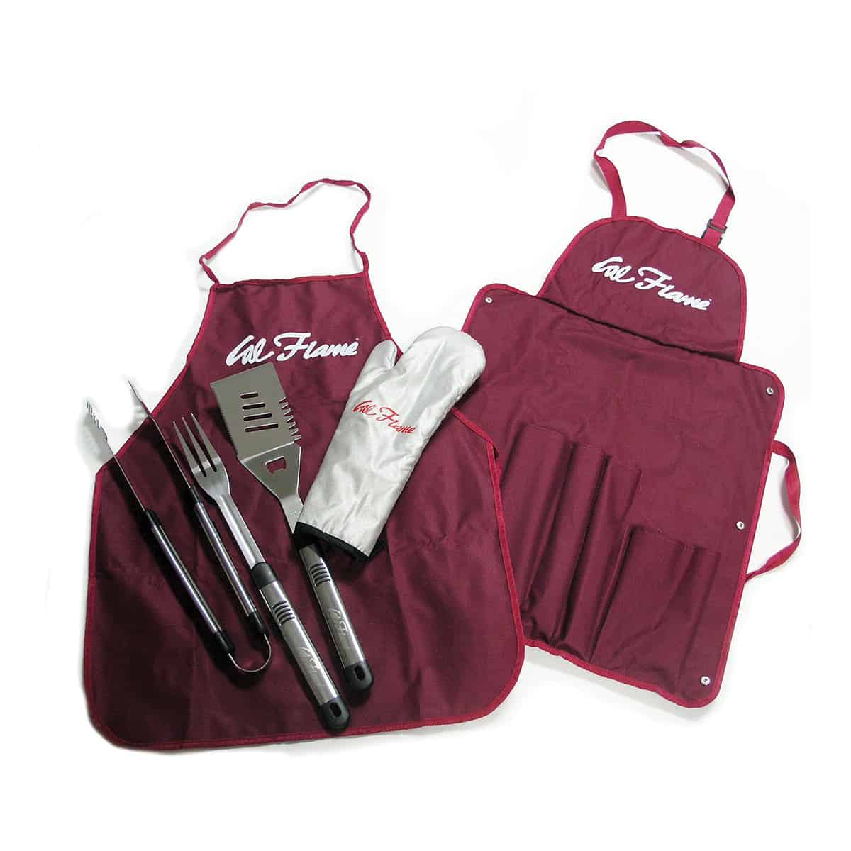The Cal Flame Utensil Set with Apron and Glove is a must have for all your grilling needs. It comes with all the accessories needed to complete the BBQ experience. Matching bag folds to hold 3 stainless steel tools, the apron, and oven mitt. The matching bag can be carried by hand or over the shoulder.