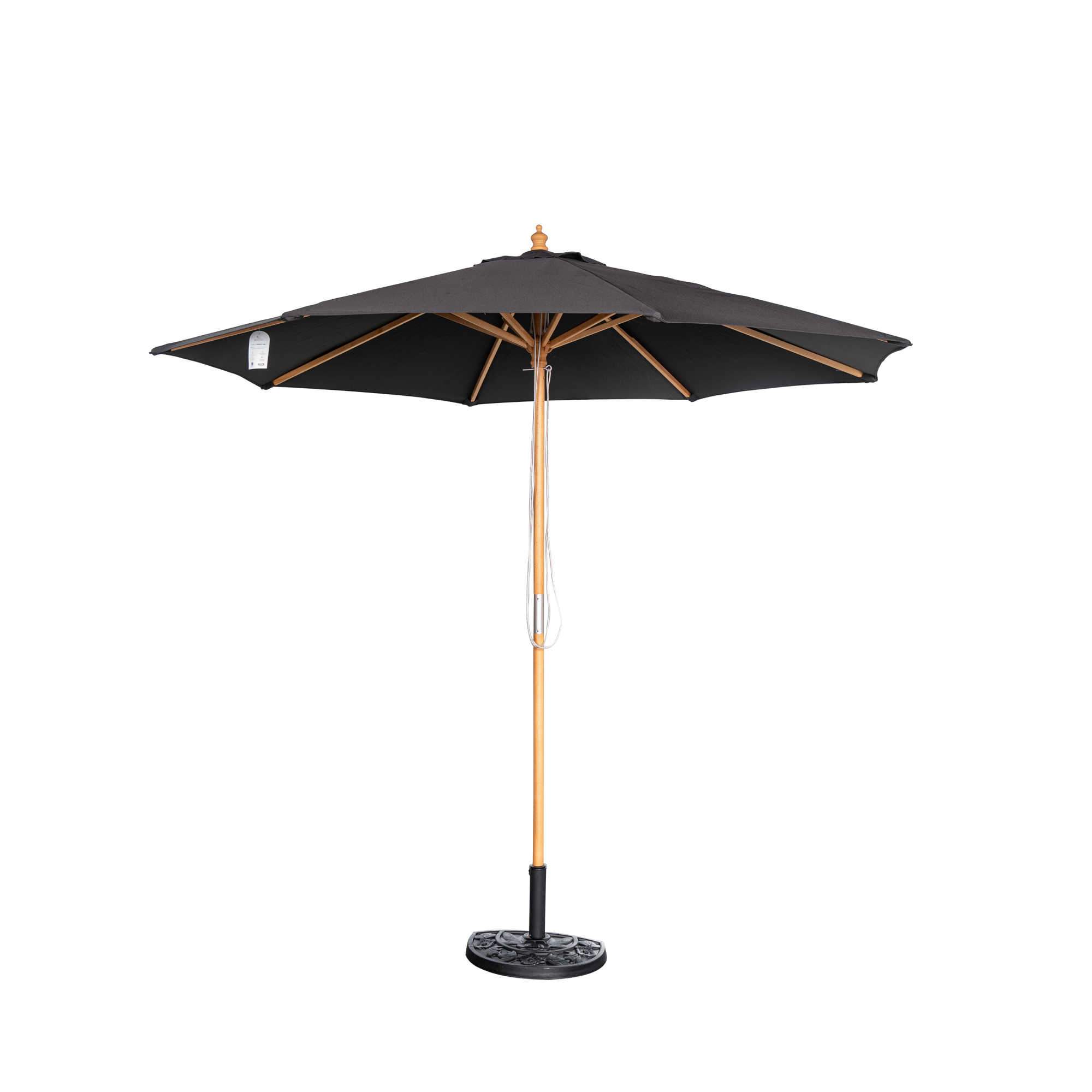 A great way to kick back, relax and escape from the stress of the day. This Cenote 9-ft Octagon Market umbrella was built to last. Its solid 1.5-in diameter hardwood pole and 8-ribs provide a sturdy support system. Keep breezes at bay with a single wind vent that allows air to easily escape during gusts. The durable, weather-resistant Breez-Tex™ canopy provides years of relaxing shade for your patio or deck. A dual pulley-and-pin system makes it easy to open and close. Its decorative polymer finial adds a finishing touch. This stylish shade system instantly delivers up to 57 square feet of shade space providing necessary relief during those grueling hot summer days. The Cenote umbrella is backed with a 3-year Breez-Tex™ canopy fabric warranty and a 1-year warranty on the hardwood umbrella pole and support system. Base sold separately.