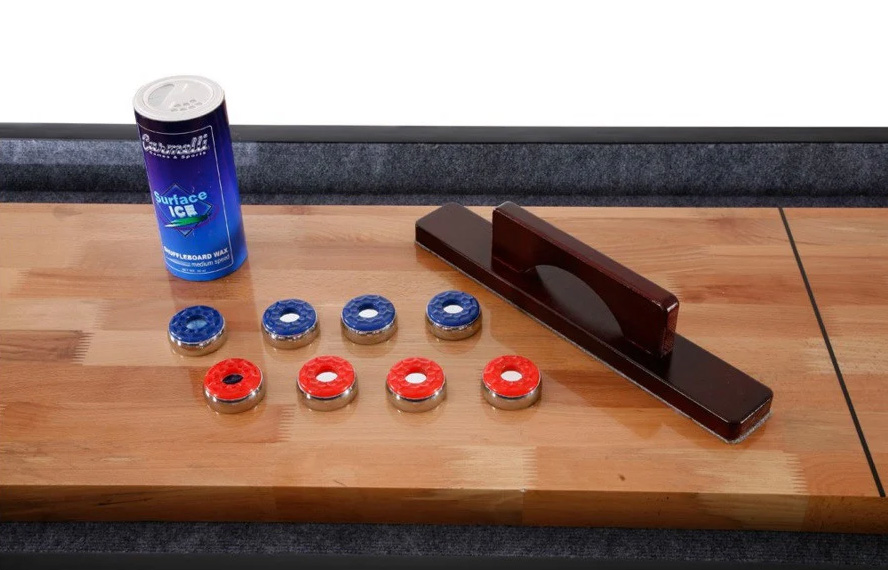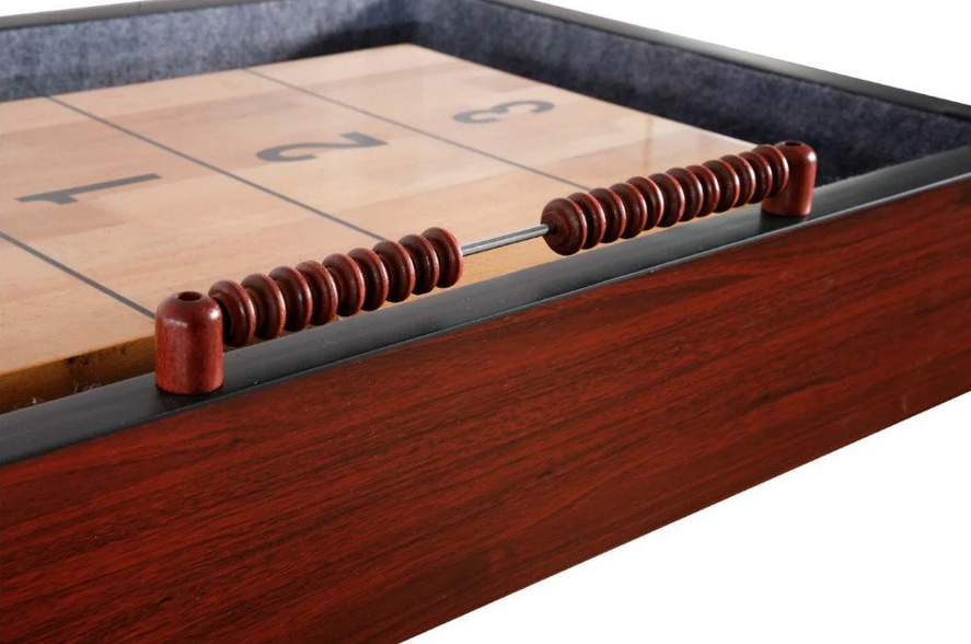 Durable “CARB” certified MDF cabinet with dark cherry or walnut laminate has cabinet grade plywood corners that are very strong and allow your table to arrive undamaged. At the base of the sturdy legs are large 6″ independent leg levelers that allow the table to be leveled on any uneven surface. Two wood scoring abacuses keep track of the winner in highly contested games. The table comes complete with 4 blue pucks, 4 red pucks, 2 abacus scoring units, 1 table brush and 1 can of table wax.