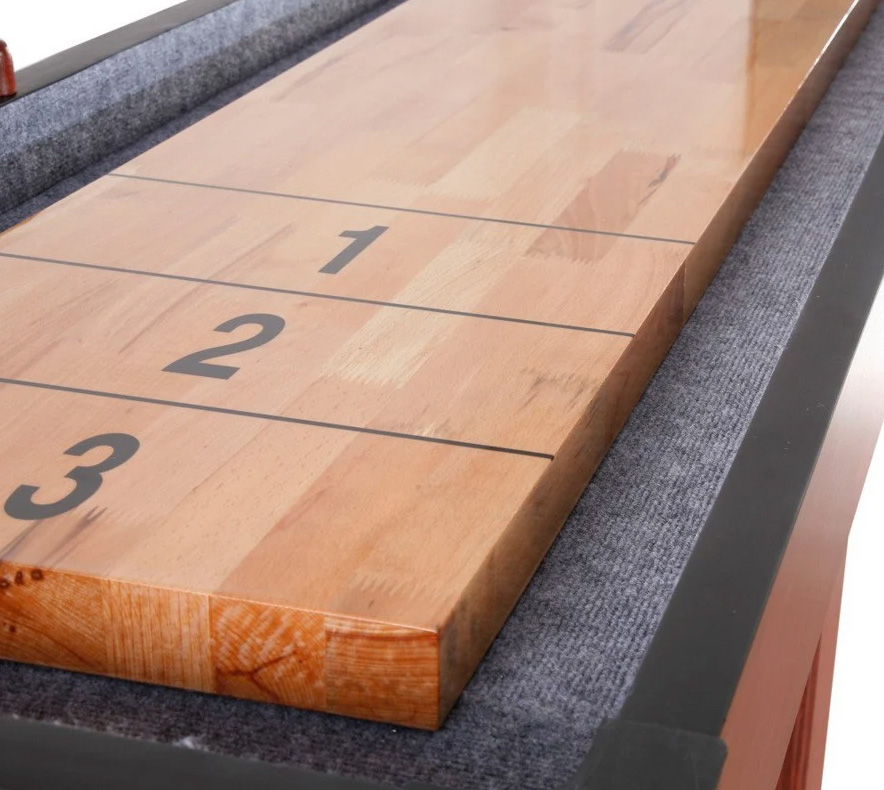 The Challenger Shuffleboard Table is packed with quality features. The thick 1½” solid finger jointed hardwood butcher block playing surface is finished in a smooth, glossy polyurethane finish for durability and to ensure that the puck slides true. Since tables can become “humped” during humid weather and dished during dry weather, “Climate Adjusters” are included on the table. “Climate Adjusters” allow you to smooth out any variations that the hardwood surface may require due to changes in humidity. No other table in this price range offers this feature!