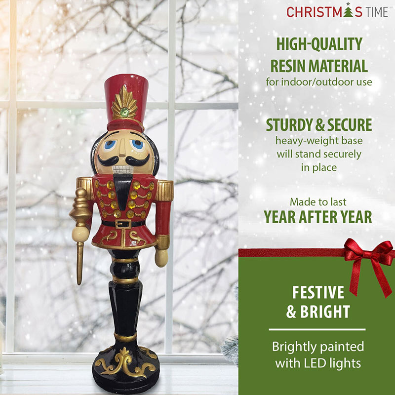 Our impressive nutcracker greeter stands 36 inches tall and is prelit with 17 LED lights. Dressed in his red coat and tall red hat, he will add a special glow to your porch, entryway, fireplace hearth, or near the tree. For decorations that celebrate the magic of Christmas, count on quality products from Christmas Time.