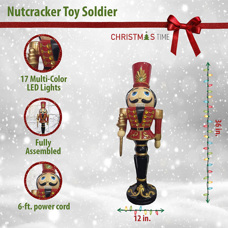 - PRE-LIT WITH COLORFUL LED LIGHTS: Our nutcracker stands 36 inches tall and is prelit with long-lasting gold and green LED lights that will add a modern glow to your Christmas decorating.