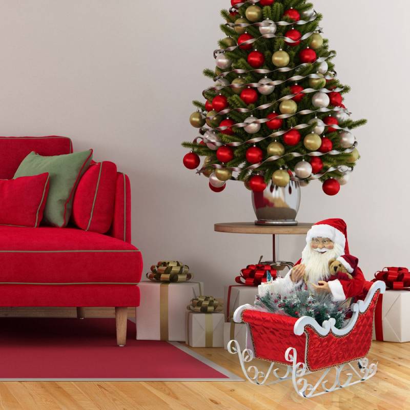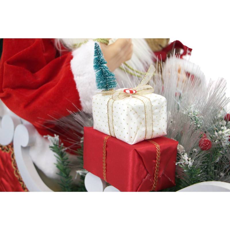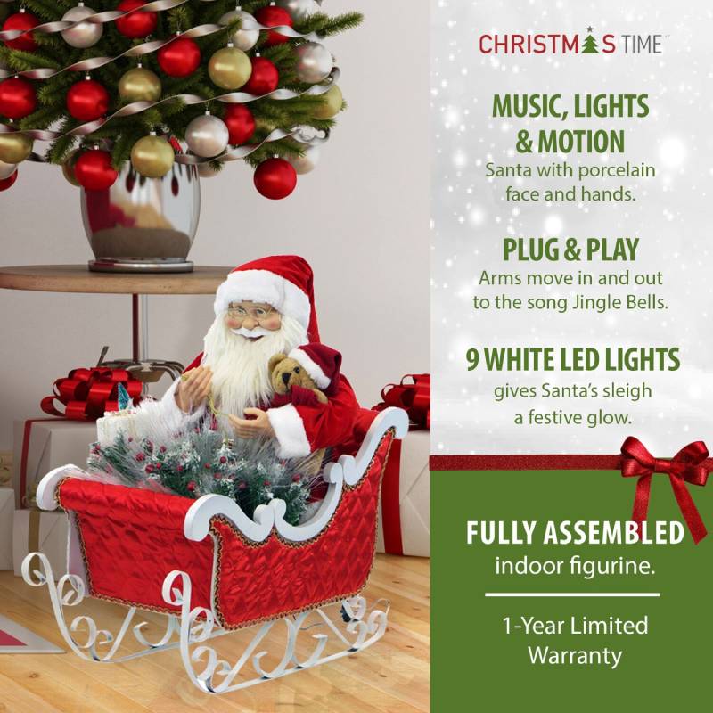 Santa is coming to town! From Christmas Time, this music, lights, and motion Santa will fill your home or office with the magic and wonder of the holiday season. Traditionally dressed in his red suit trimmed with white fur, Santa holds a teddy bear. His quilted red sleigh is packed with wrapped gifts and greenery illuminated by 9 white LED lights. When you plug him in, he moves his arms in and out to Jingle Bells. Sure to become a cherished heirloom passed down through the generations, Santa in his Sleigh will add a whimsical touch to your foyer, in your favorite window, next to your Christmas tree. Make your winter wonderland dreams come true, or gift it to that special someone on your list for many years of enjoyment.